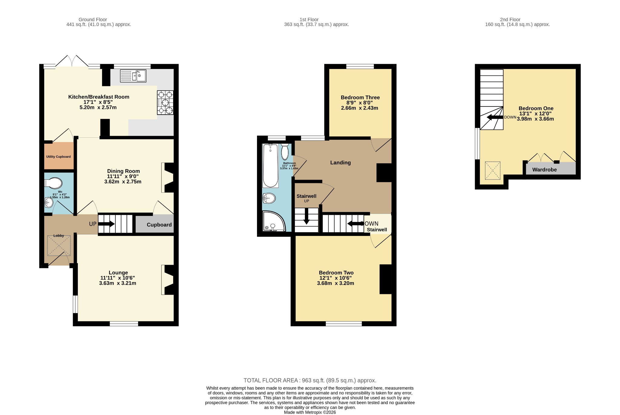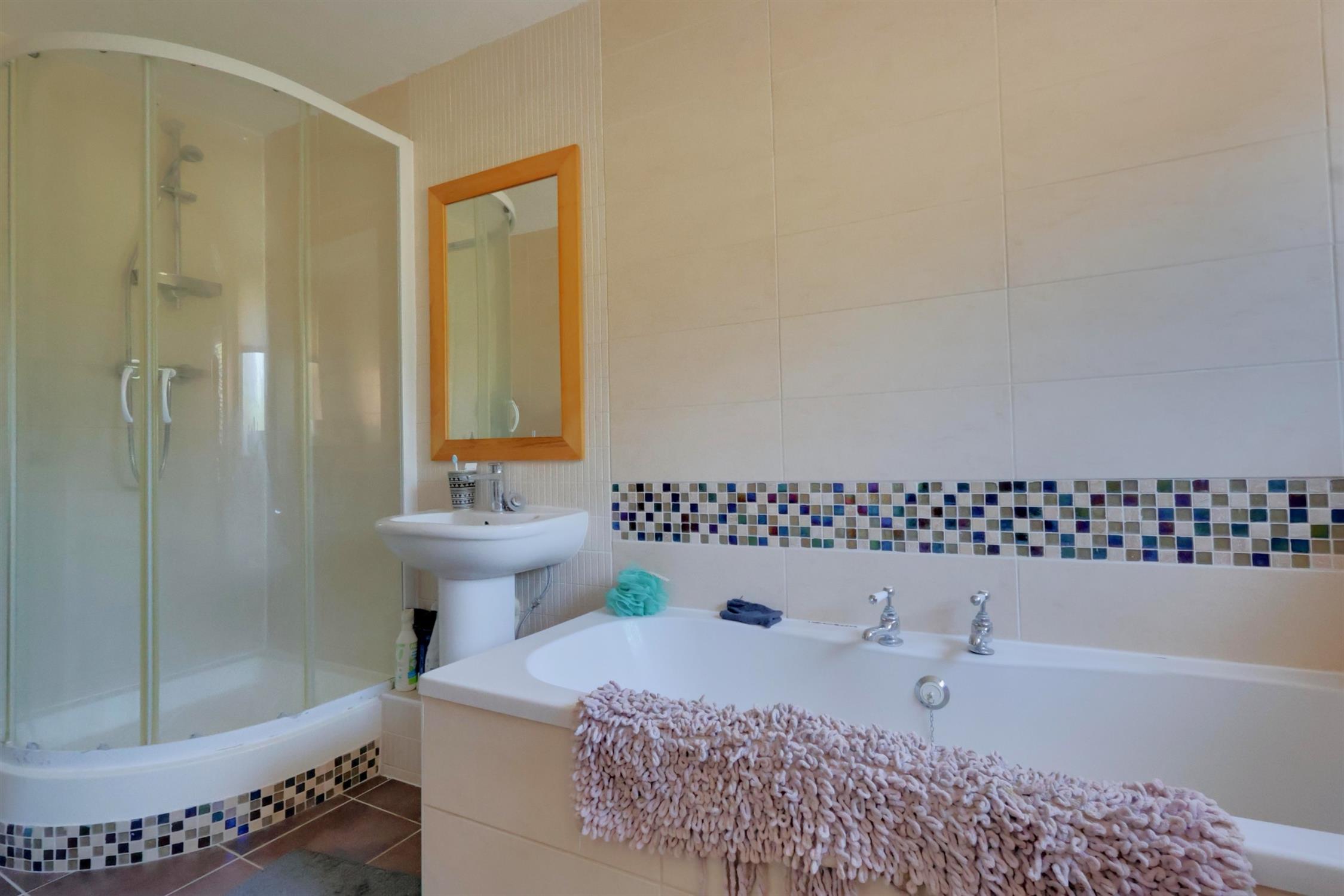 Double glazed window to rear elevation, consists of a four piece suite, panel bath, mains pressure shower, pedestal wash hand basin, enclosed cistern WC, tiled walls and floor, ladder radiator, smooth ceiling, inset spot lighting.