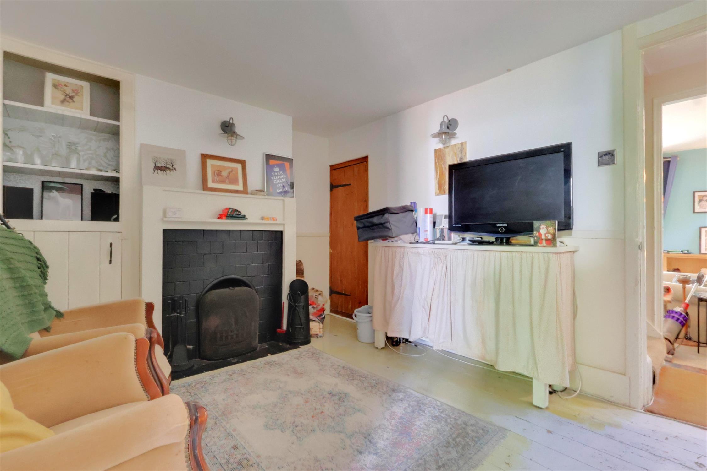 Under stairs cupboard, radiator, wooden floor, cupboard, open fire with mantle over.