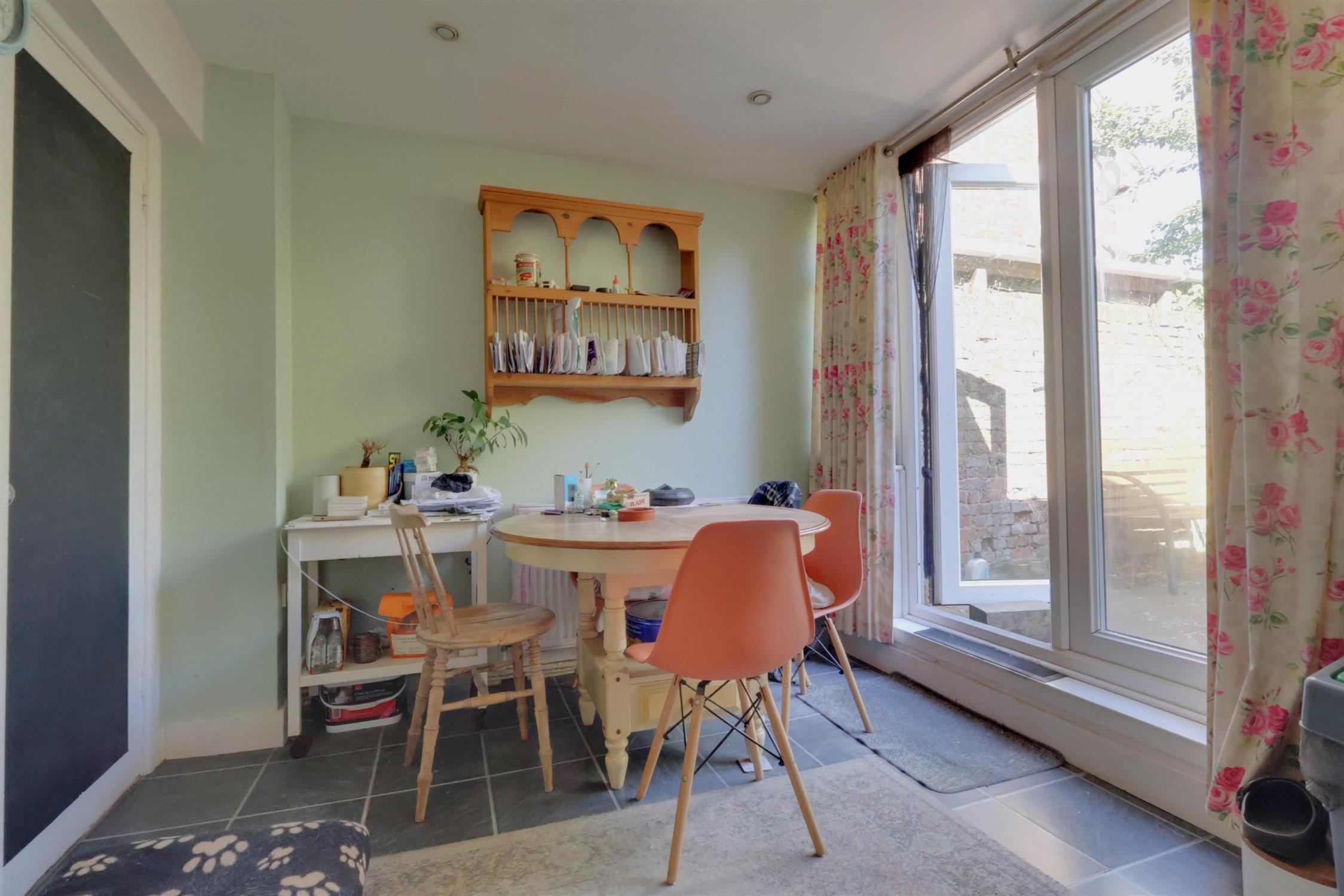 Doors to ground floor rooms, part glass roof, tiled flooring.
