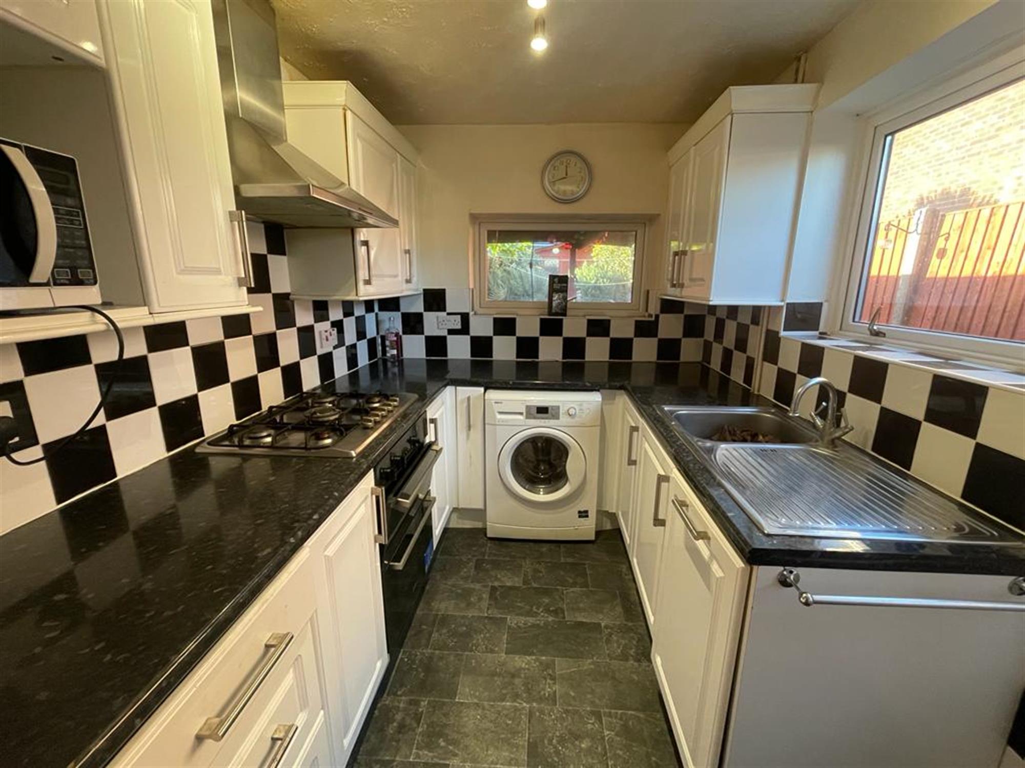 A modern kitchen with a range of wall and base units and white goods to include a fridge/freezer, a washing machine and a gas hob & oven.