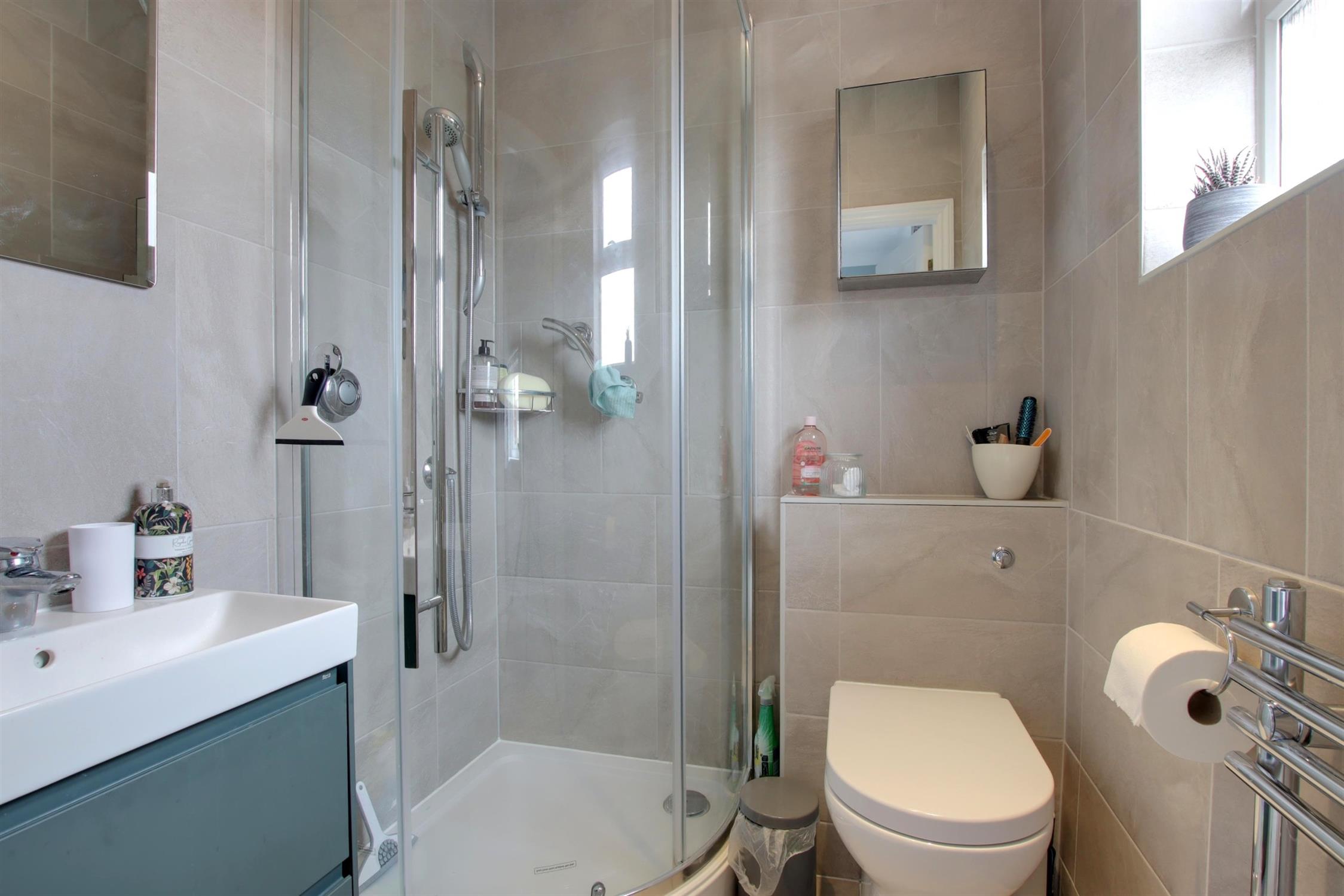 Double glazed window to front elevation. Modern re-fitted suite comprising; shower cubicle. Low level close coupled WC. Pedestal wash hand basin with storage beneath. Tiled walls. Heated towel rail. Tiled flooring. Extractor fan. Inset ceiling with spotlights and extractor fan.