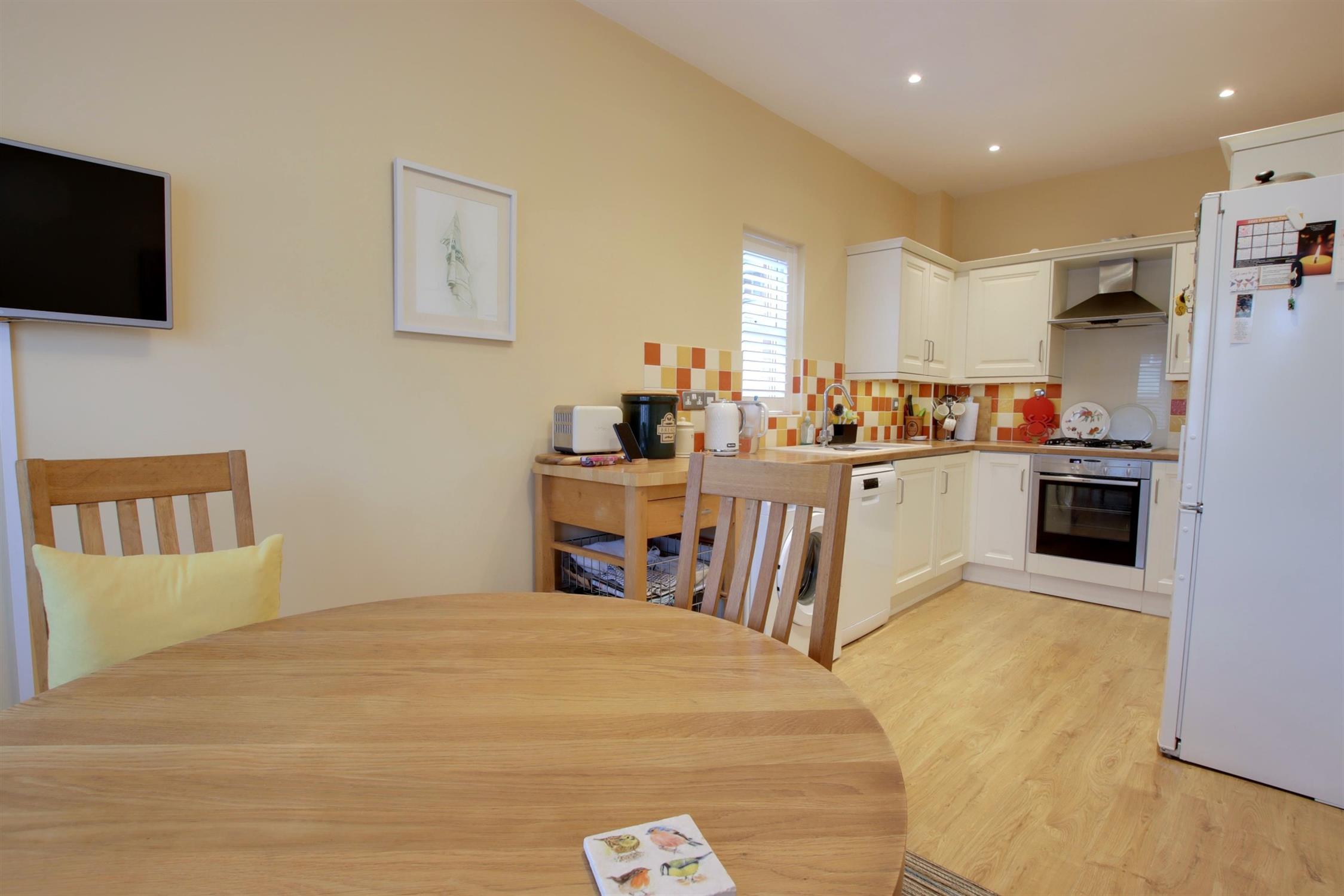Double glazed bay window to front elevation and double glazed window to side elevation with fitted plantation shutters. Kitchen comprising; one and a half bowl single drainer sink unit with cupboard under. Further range of wall and base level units with roll edge work surfaces over and splashback tiling. Built in four ring gas hob with electric fan assisted oven under and cooker hood over. Recess for fridge/freezer. Freestanding dishwasher to remain. Space and plumbing for washing machine. Pull out larder cupboard. Pan drawers. Corner carousel unit. Area for dining table. Radiator with decorative cover. Laminate flooring.