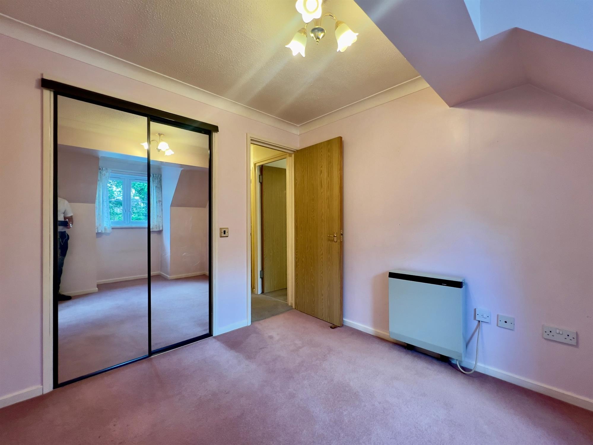 Double bedroom with double-glazed window to front aspect. Wall mounted electric heater. Carpet. Built-in mirrored wardrobe. Emergency pull cord.