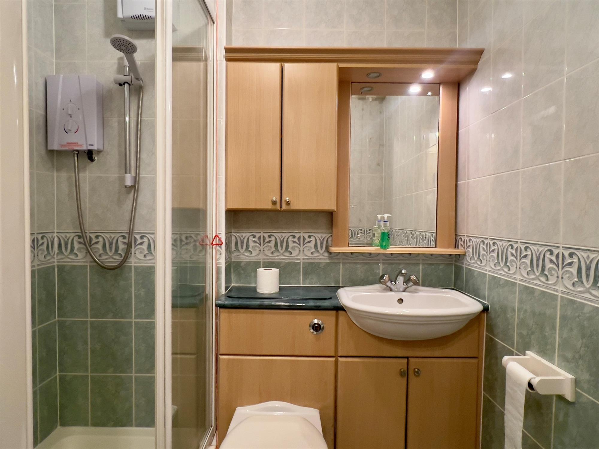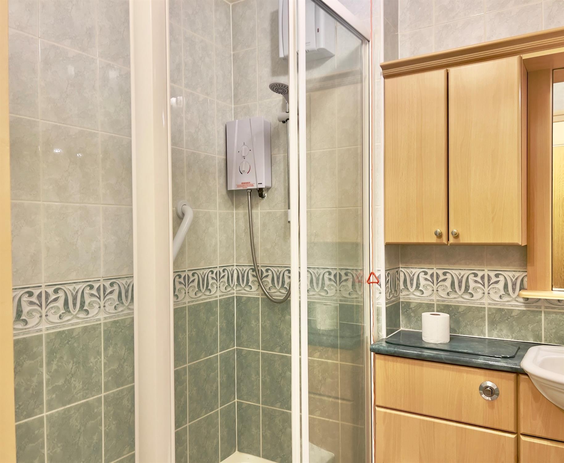 Three-piece suite comprising shower cubicle, pedestal wash hand basin and low level WC. Fully tiled walls and flooring. Wall mounted cupboard. Extractor fan. Emergency pull cord.