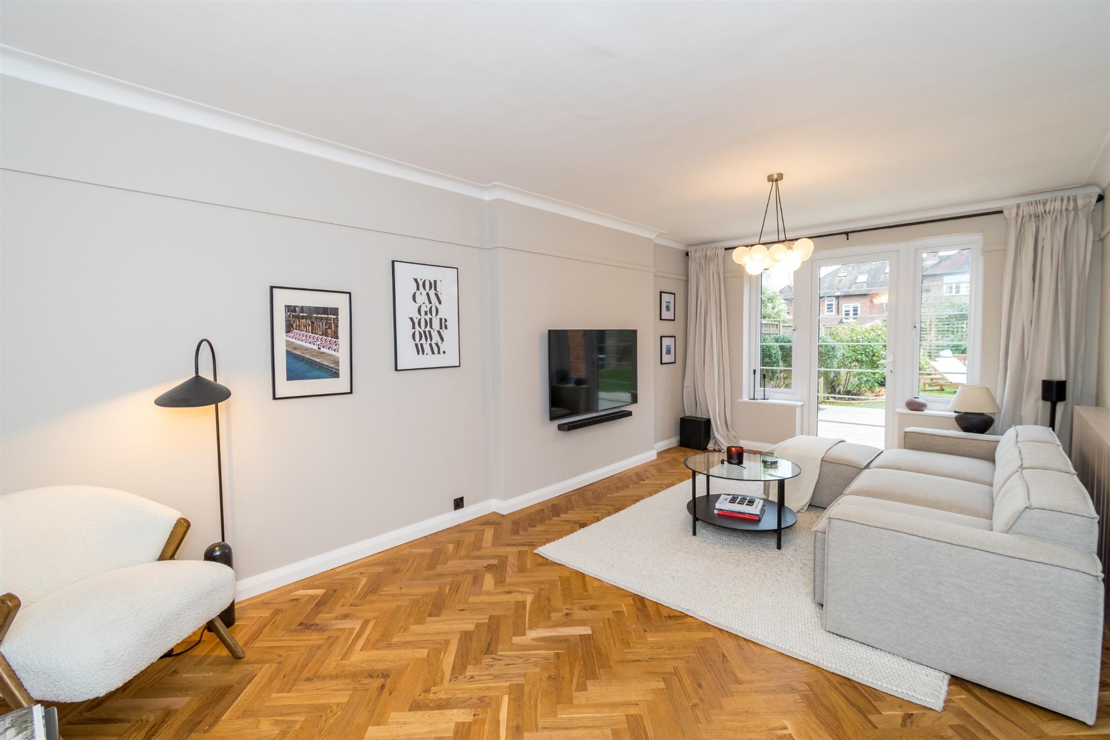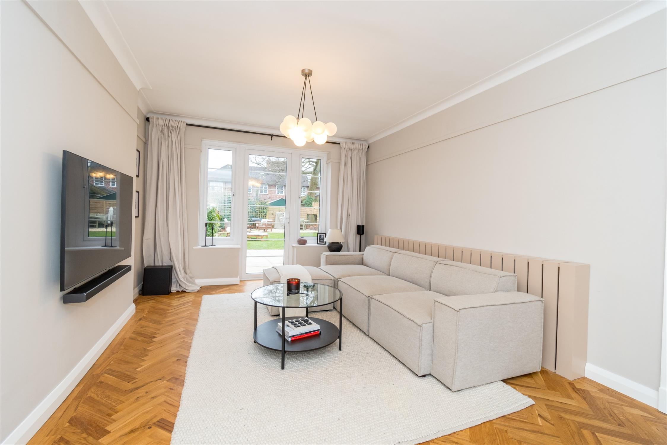 An elegantly appointed dual aspect room with double glazed window to front elevation and double glazed, double doors and flanking double glazed windows to rear elevation. Herringbone oak wood flooring. Coved ceiling. Picture railing. Radiator with contemporary cover.