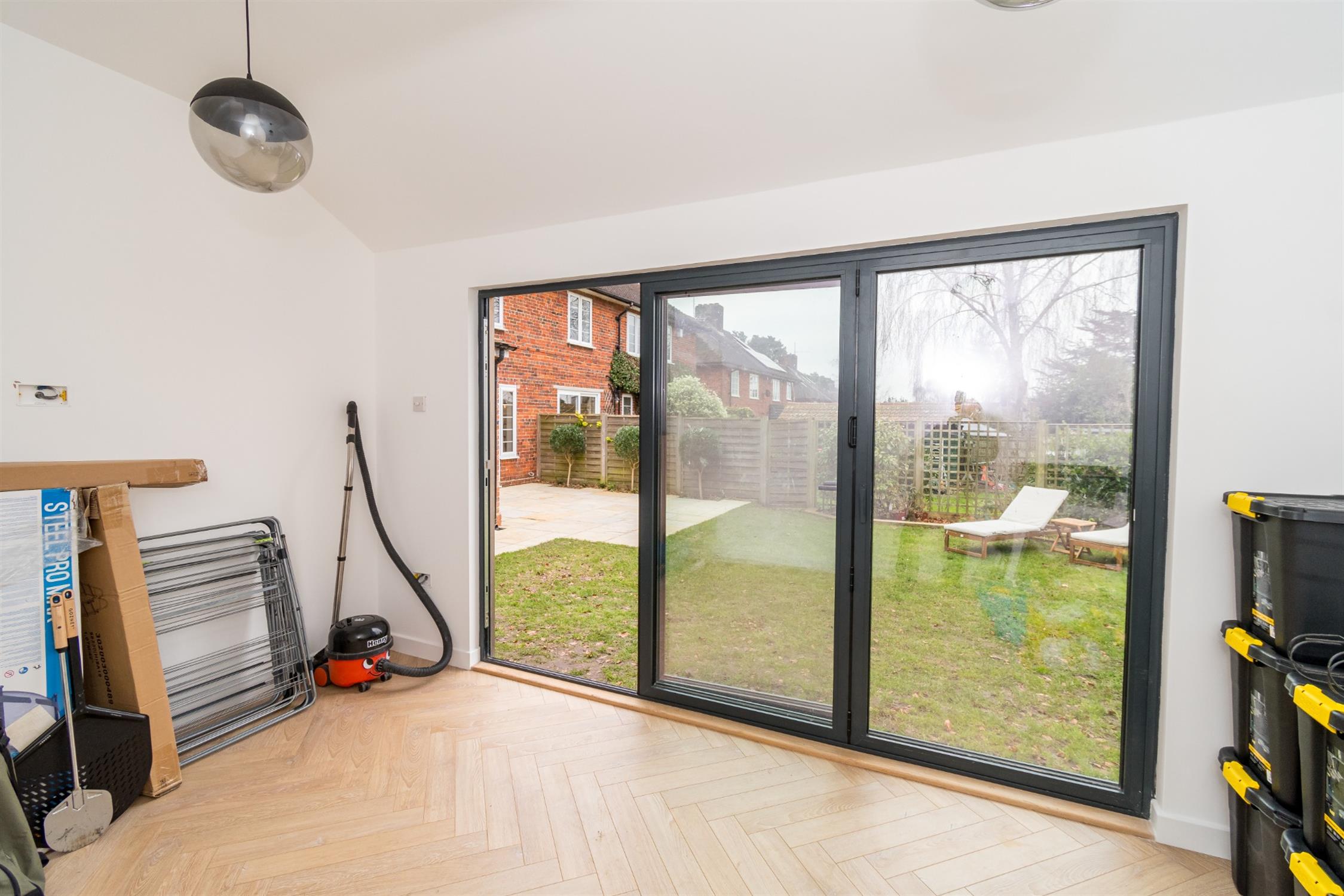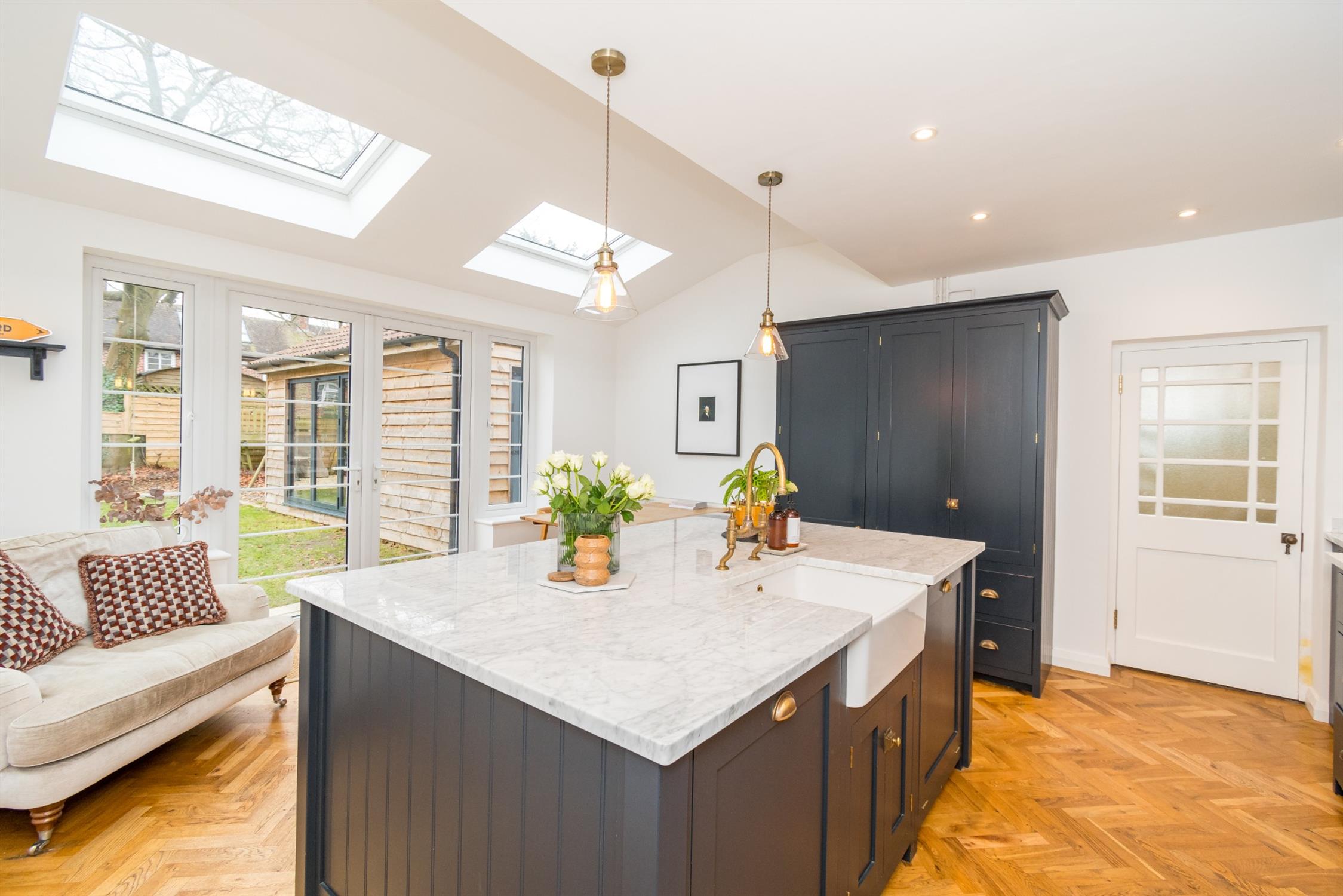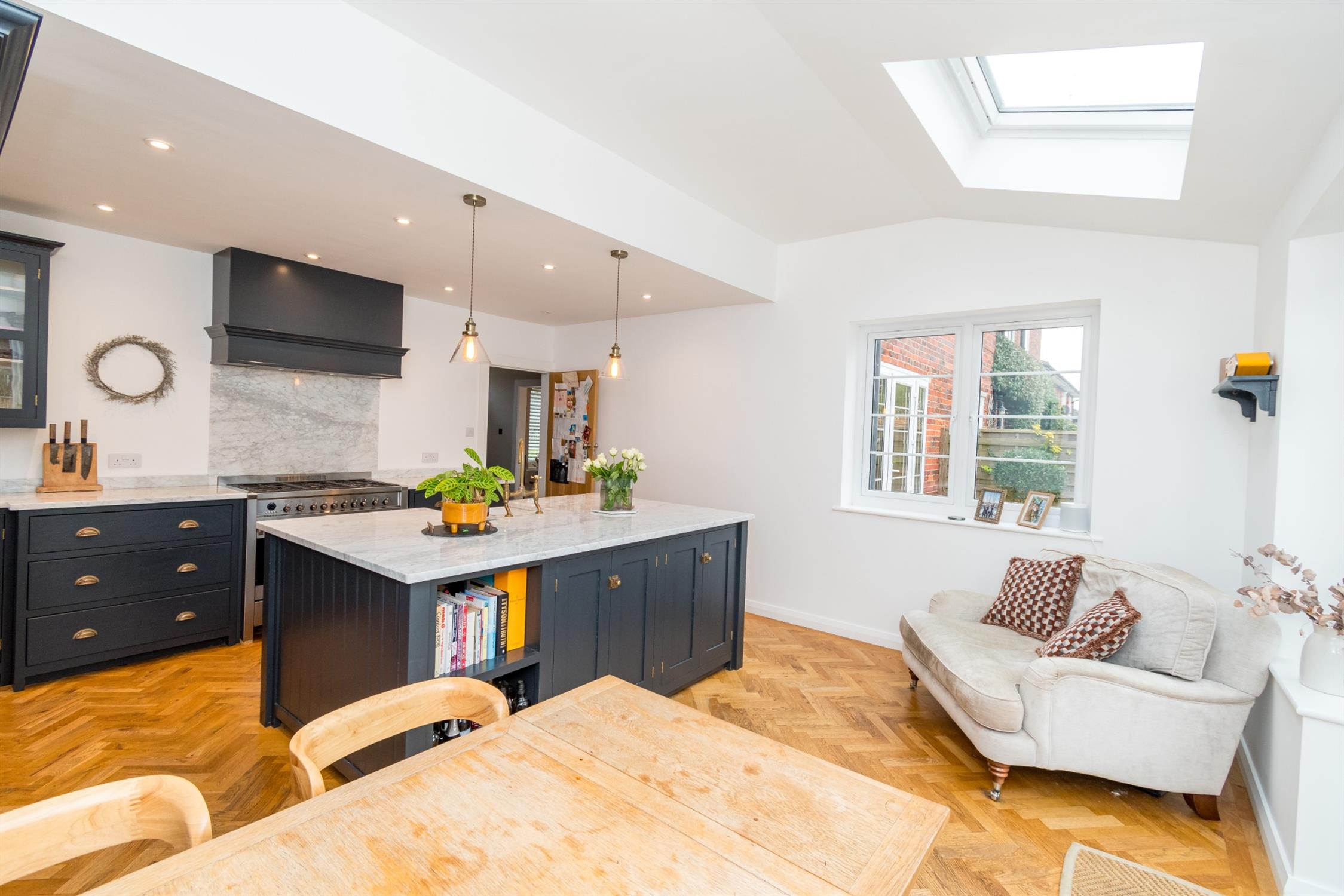 Undoubtedly one of the property's outstanding features is the extended kitchen/dining room which has been comprehensively refitted with a bespoke hand made kitchen manufactured and installed by Devol. A comprehensive range of units trimmed with contrasting marble and central island feature with matching marble finish housing under laid sink as well as integrated washing machine and dishwasher. Feature extractor hood with suitable space for range style cooker and splash back. Smooth plastered ceiling with recessed lighting. Triple aspect room also benefiting from double glazed window to side elevation. A high degree of natural light is provided by two velux style double glazed windows. Further double glazed door to side elevation and double glazed double doors flanked by two further double glazed windows leading to the rear garden. Herringbone oak wood flooring. Radiator.