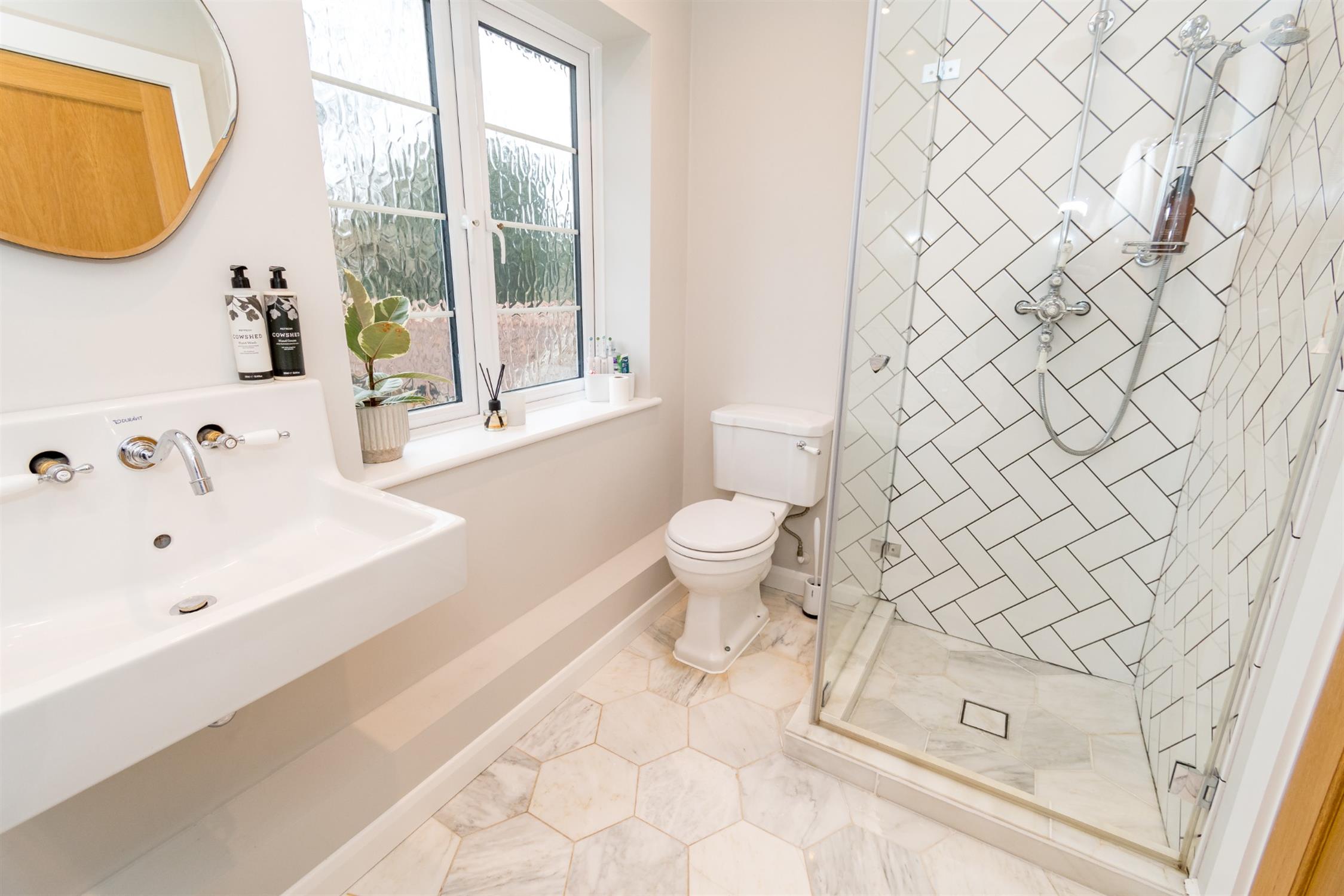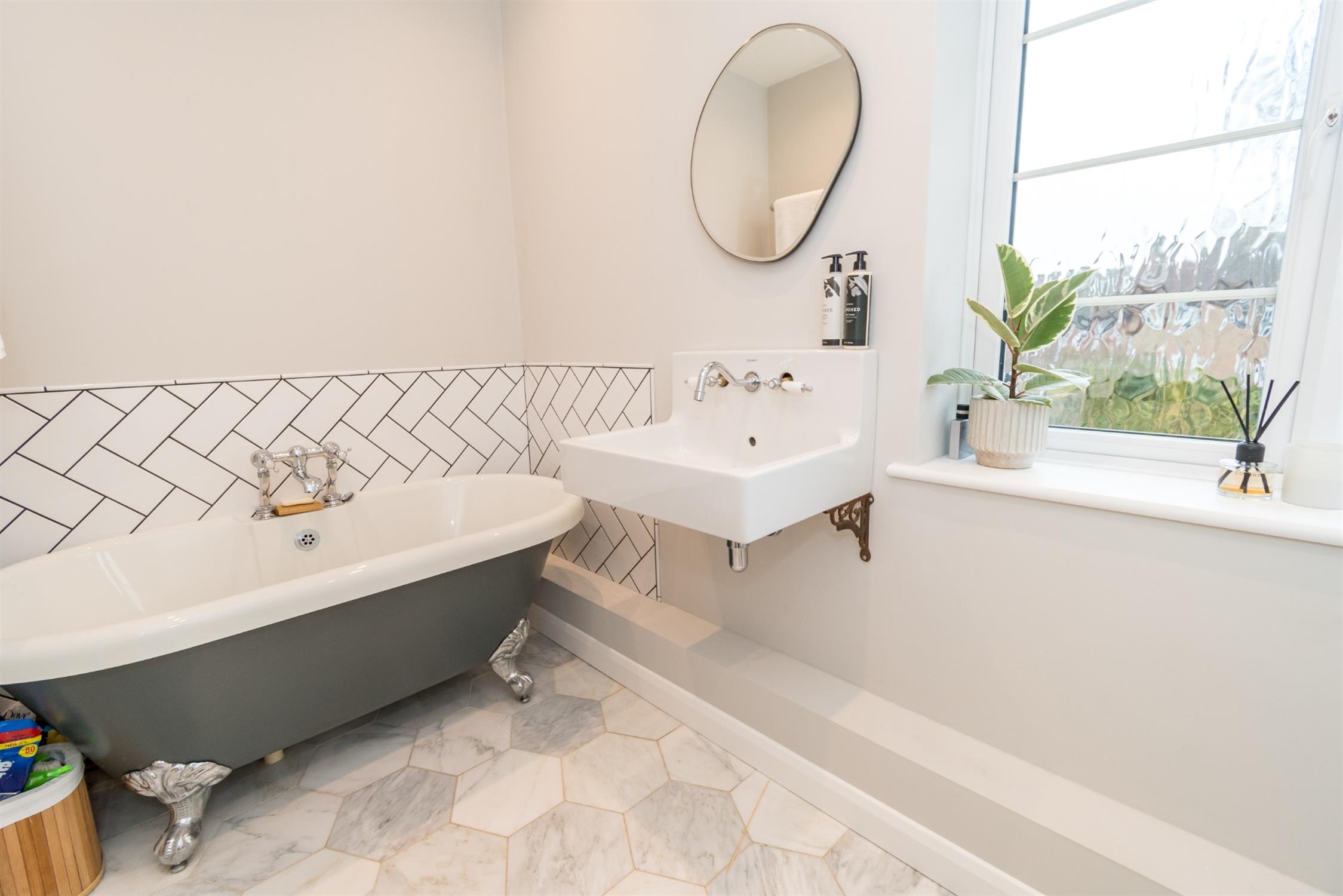 The family bathroom has been comprehensively remodelled and offers a free-standing claw foot roll top bath with mixer tap fitting, wall hung Duravit rectangular sink with mixer tap fitting, low level w.c. and tile enclosed shower with rainfall shower head and separate body washing attachment. Double glazed window. Smooth plastered ceiling with recessed lighting. Wall mounted chrome finish ladder style/towel rail/radiator combination. Tiled flooring. Tiling to bath area.