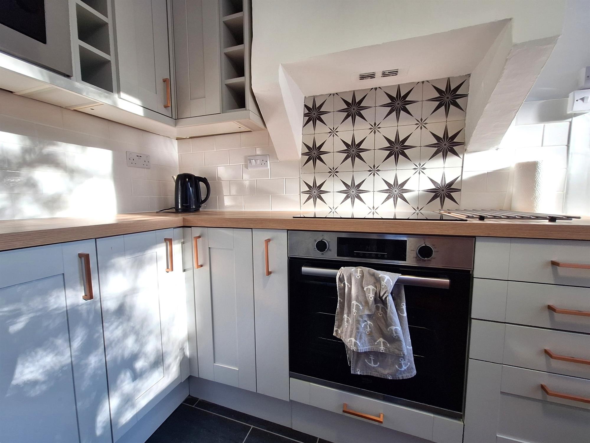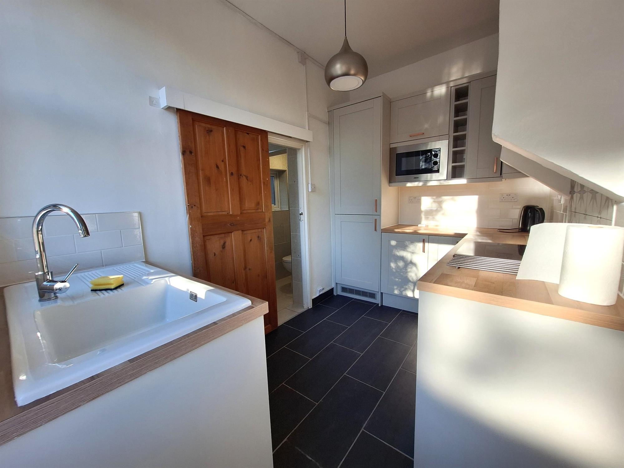KitchenContemporary fitted kitchen, with integrated fridge/freezer, electric oven with 4-point electric hob, extractor over, integrated microwave, tiled flooring, and tiled splashback, ceramic sink with drainer, chrome mixer tap.