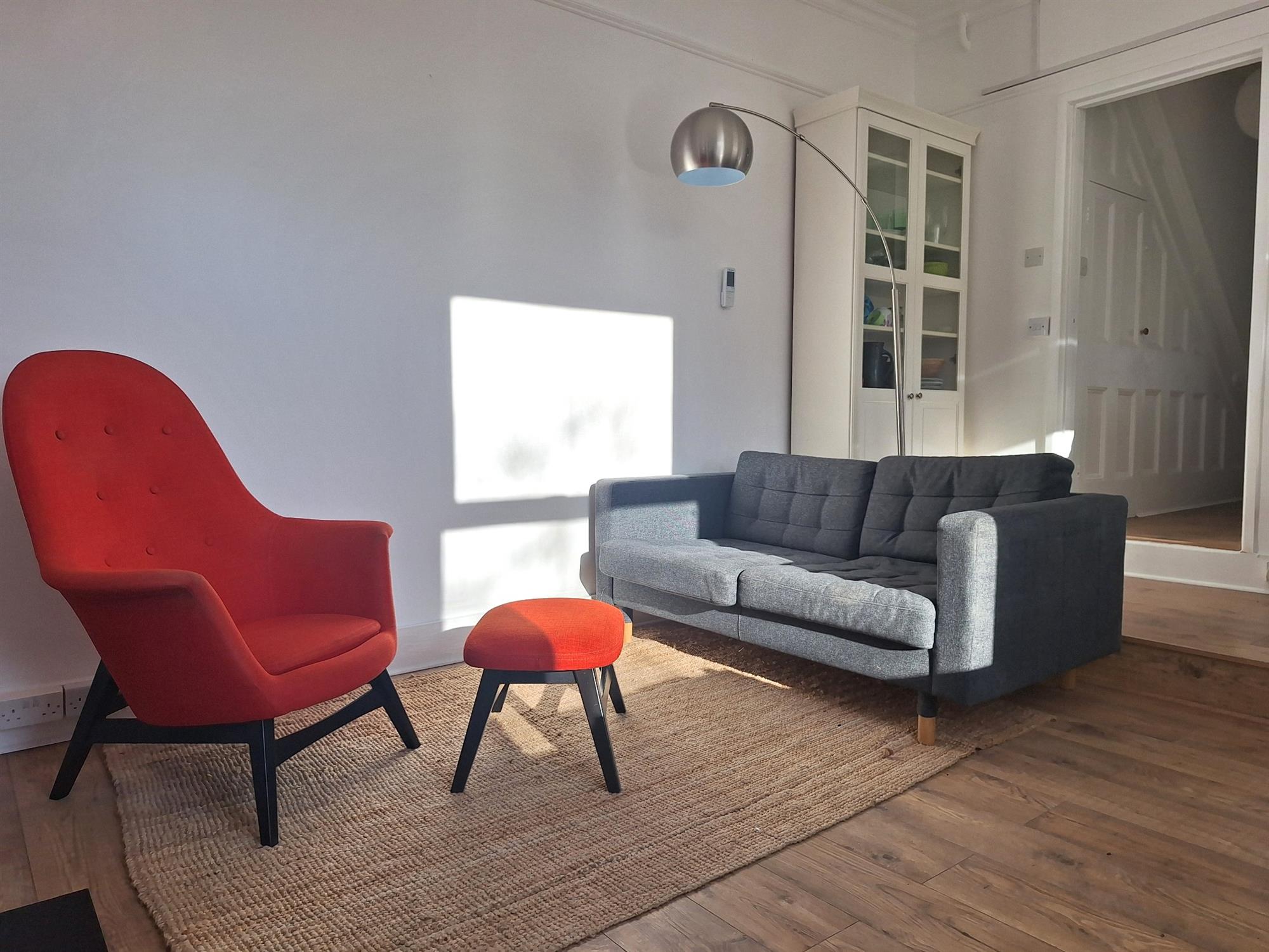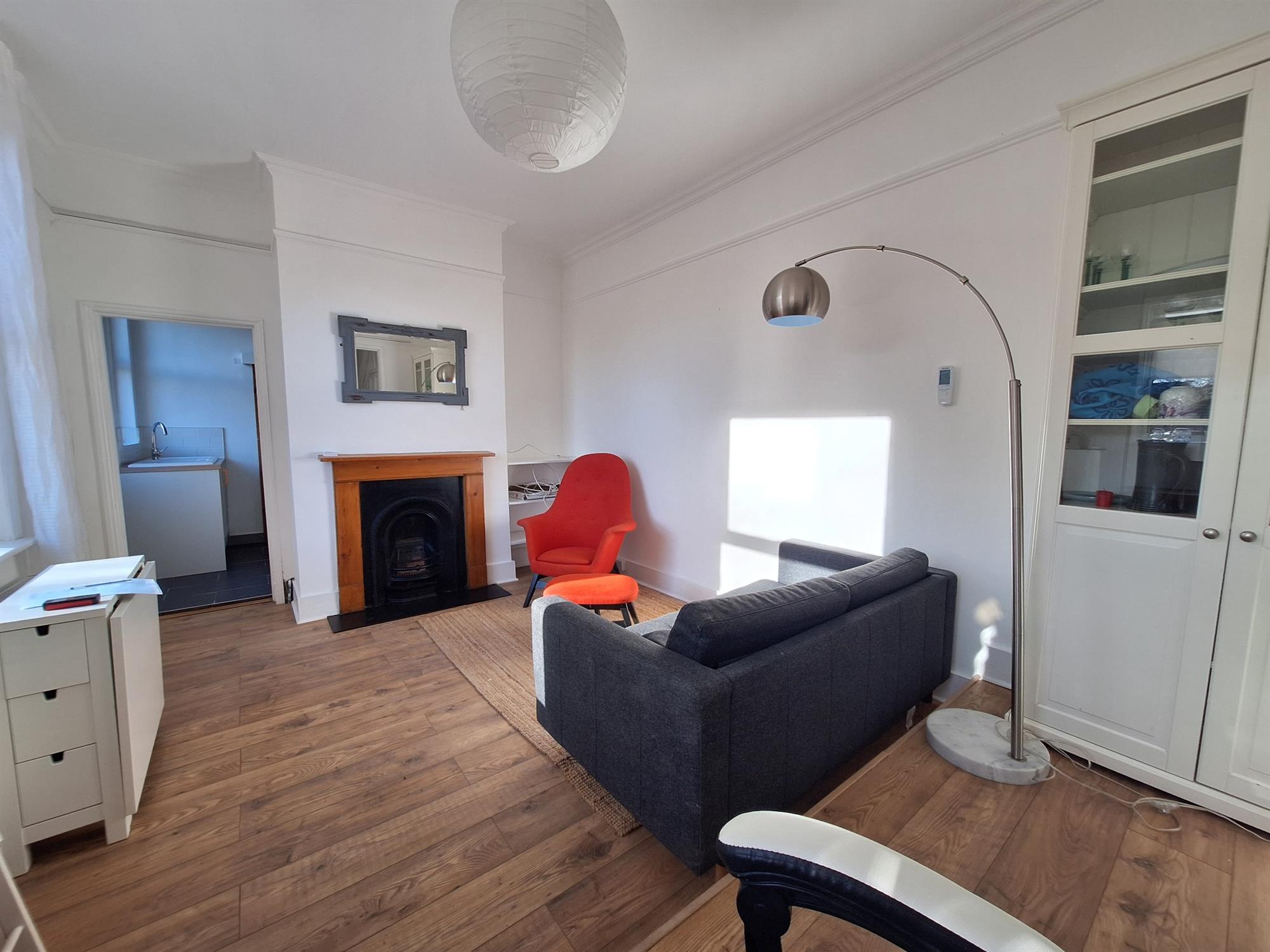 Large double-glazed bay window with half frosting, Wood effect laminate flooring, chimney breast with fireplace surround, smooth plastered ceilings.
