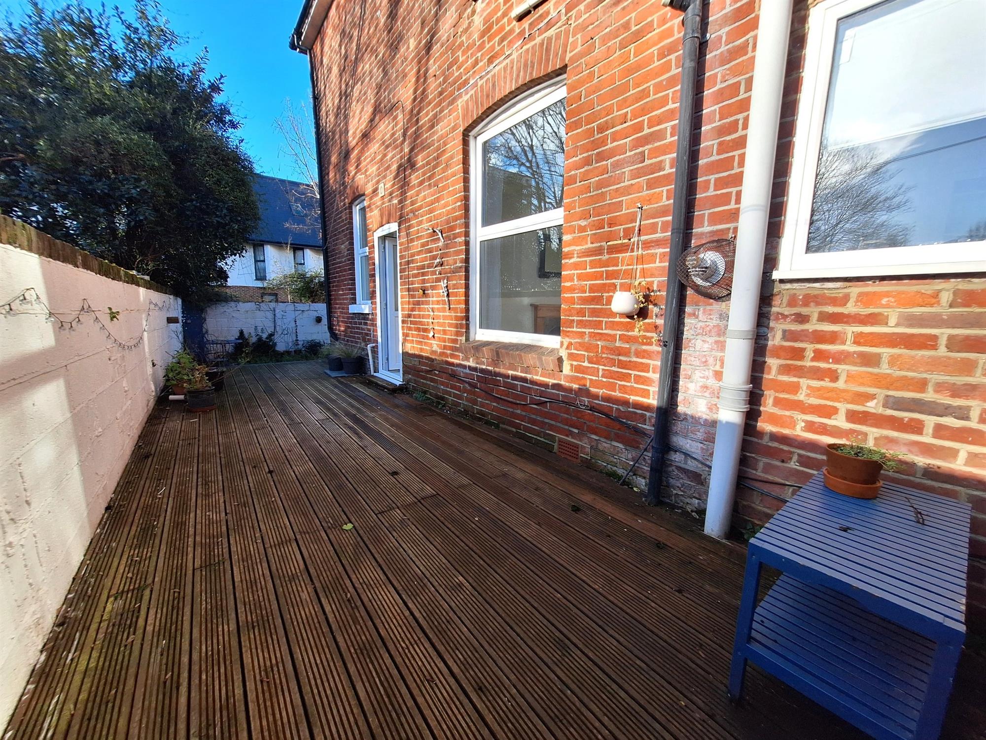 Large decking area to side aspect, stairs leading down to garden space.