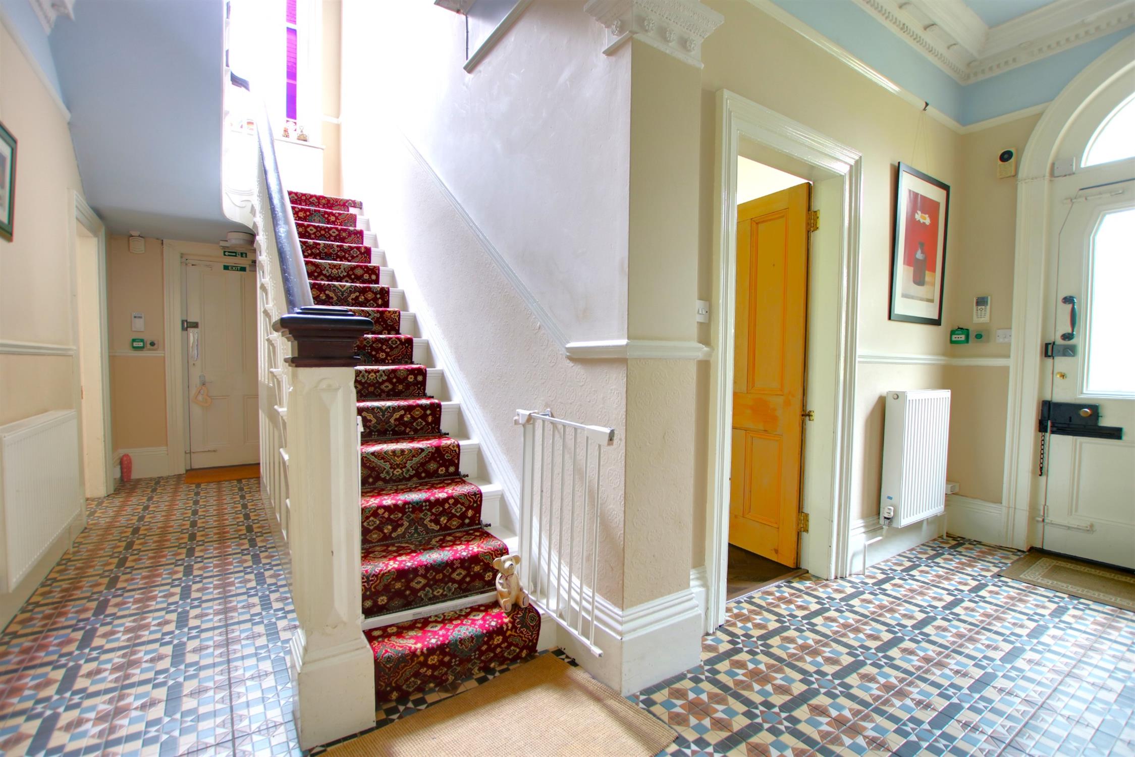 The spacious reception hallway has smooth plastered and coved ceiling with picture railing, two radiators and dado railing. The original features continue with deep feature period skirting boards and ornate ceiling roses complemented with plaster moulded buttressing. Original door architraves. Fine spindle balustrade staircase rising to first floor landing and a large tiled hallway to a dry basement. Security alarm controls. Door to side lobby. Ornate and detailed tile flooring.