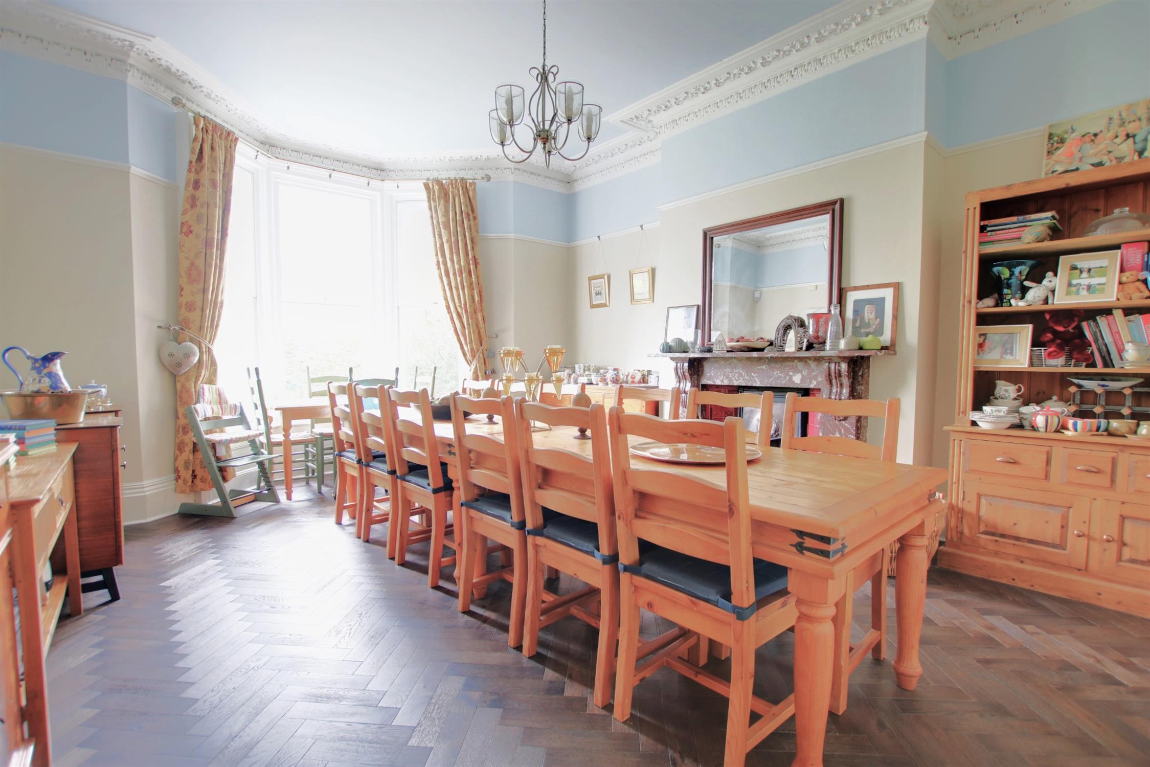 The spacious dining room again features an imposing fireplace which enhances the character of this period home. Smooth plastered ceiling finished with ornate detailed coved ceiling and picture railing. Feature sash bay window with secondary glazing. Two radiators Deep skirting boards. Feature period marble fireplace with tiled hearth feature and tiled backdrop. Herringbone dark wood flooring. Serving hatch to kitchen/lifestyle room.