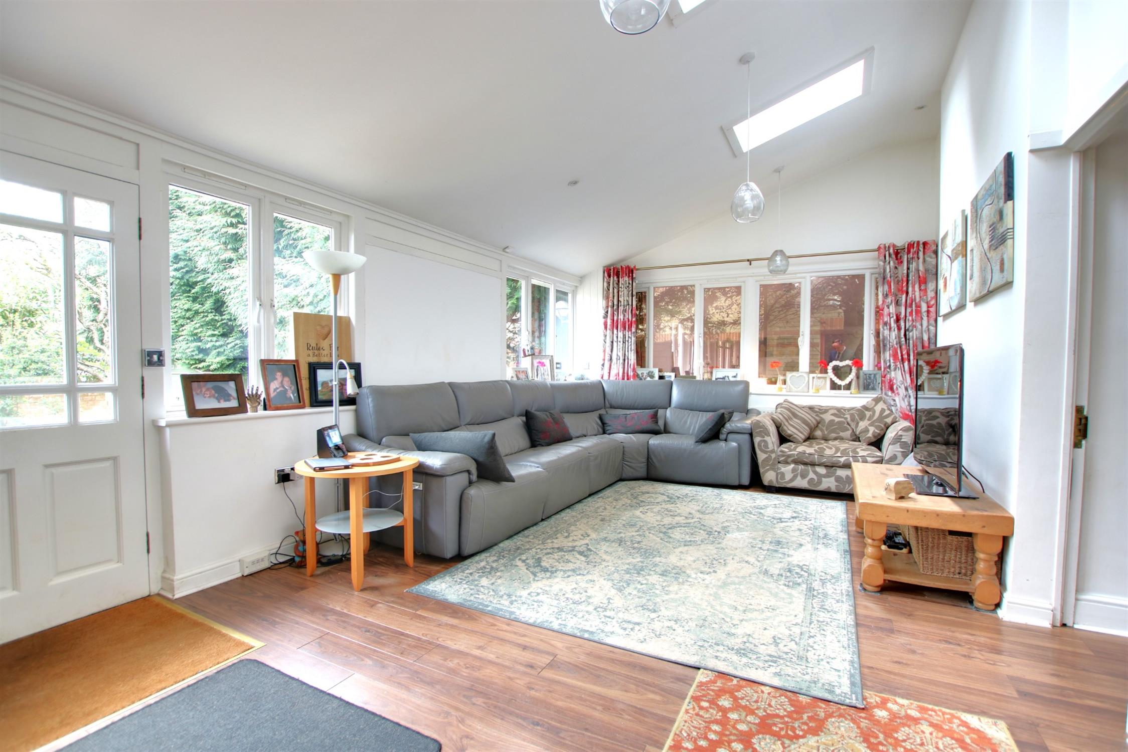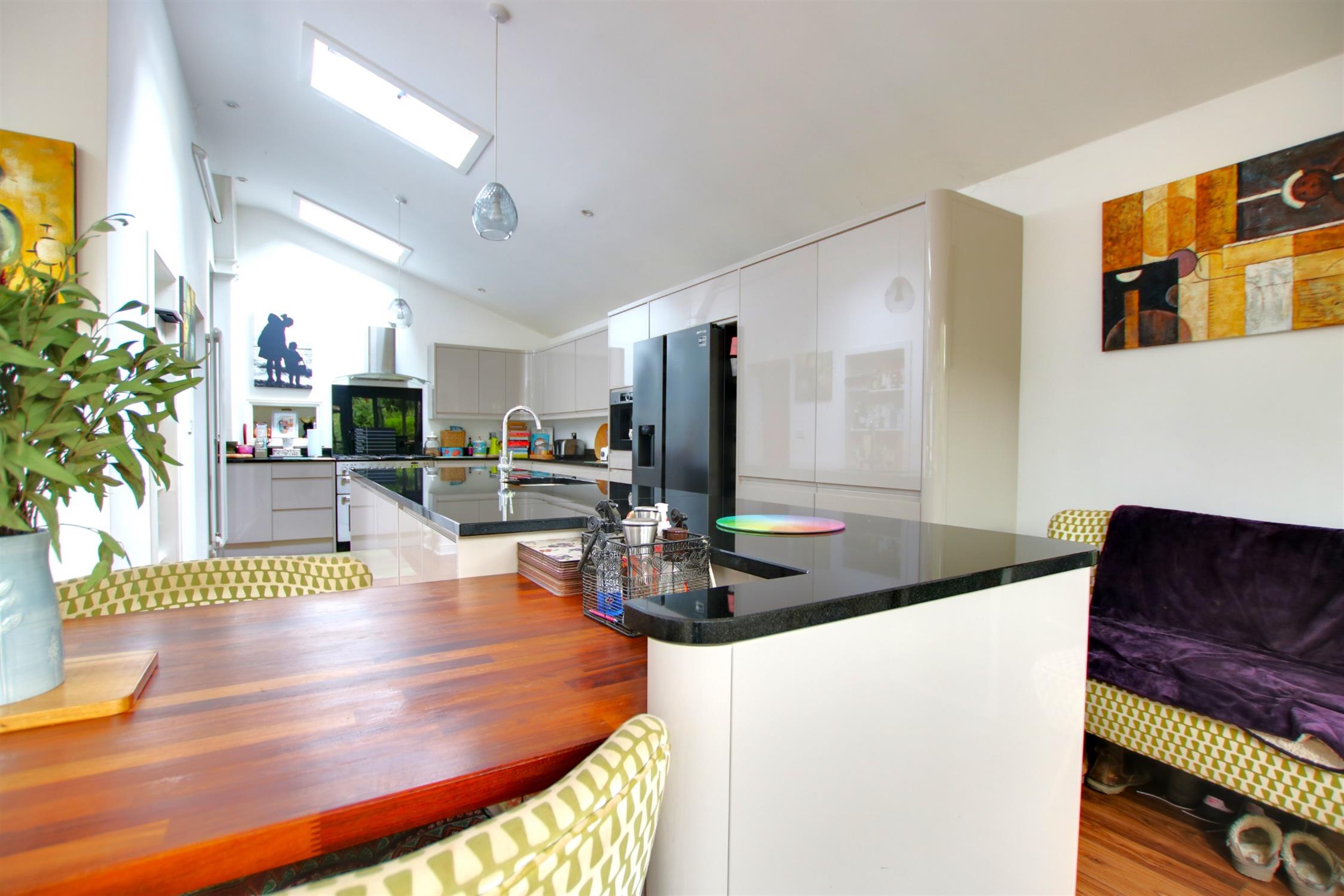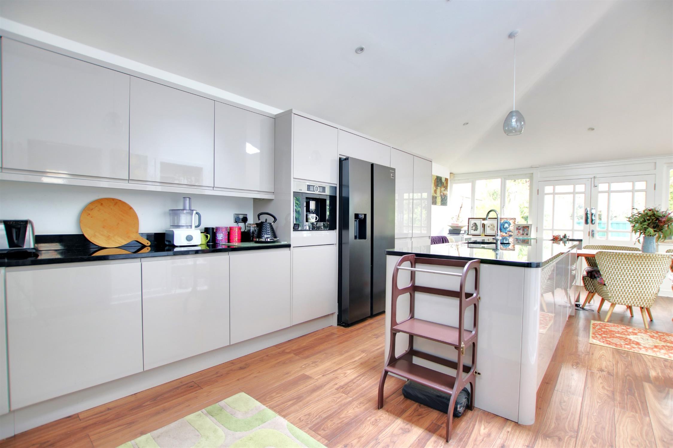 An exceptionally spacious room which has been remodelled to create a wonderful kitchen/lifestyle room. A comprehensive range of eye and base level units are finished in a contemporary high gloss style with contrasting solid granite worktops. Integrated appliances include a dishwasher, fridge, drinks cooler and coffee machine. The central island feature includes a one and a half bowl underlaid sink with waste disposal unit and mixer tap with filtered water. Integrated drainer in work top.and extended wood finished dining bar. Space for American style fridge freezer and range style cooker. Smooth plastered and skiling ceiling. Stainless steel chimney style extractor hood and splashback. Five velux style roof lights providing natural light. Double glazed windows to both side and rear elevations. Twin set of double glazed double doors leading to rear garden, one with steps leading to rear garden area and one with further access to the deck with spindle ballustrading. Recessed halogen lighting. Further door leading back to monring room. Wood effect flooring. Multiple radiators including one feature radiator.