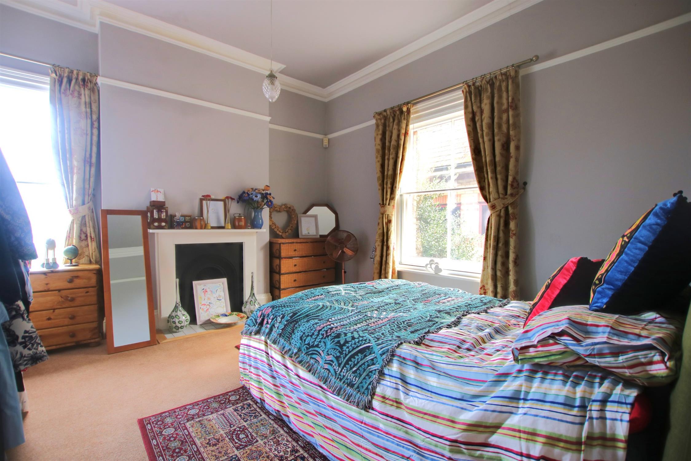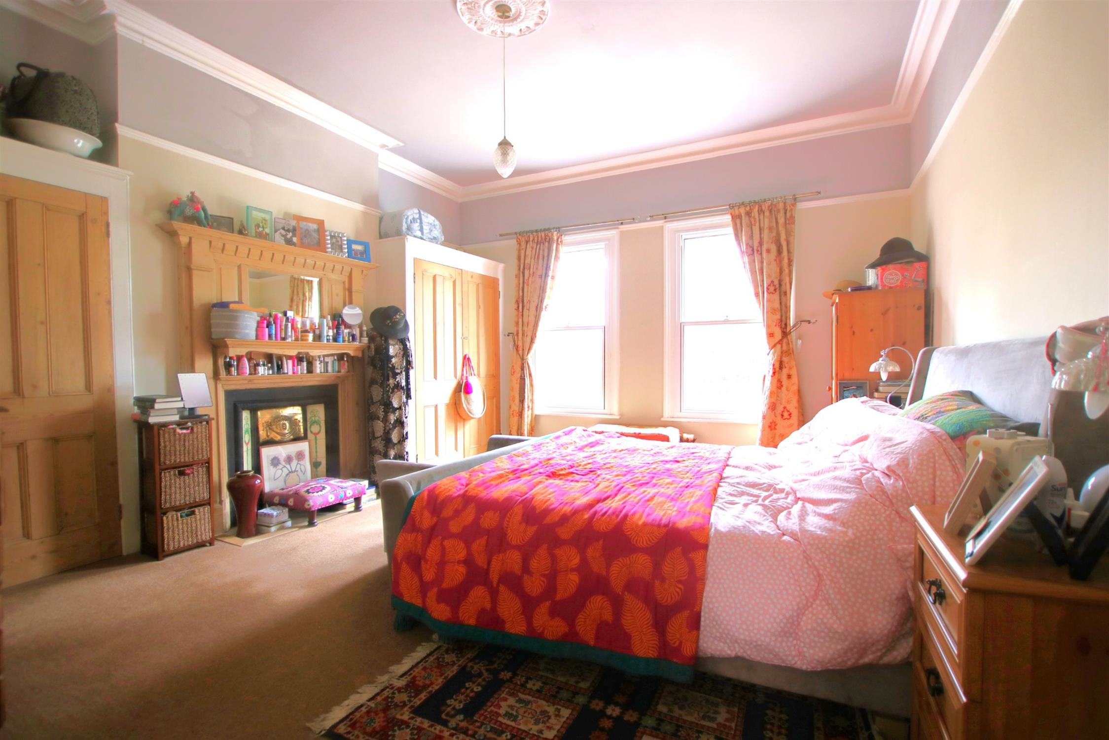 Dual aspect room with two sash windows and secondary glazing. Smooth plastered ornate coved ceiling. Picture rail. Radiator. Ornate ceiling rose. Feature fireplace with wooden surround.