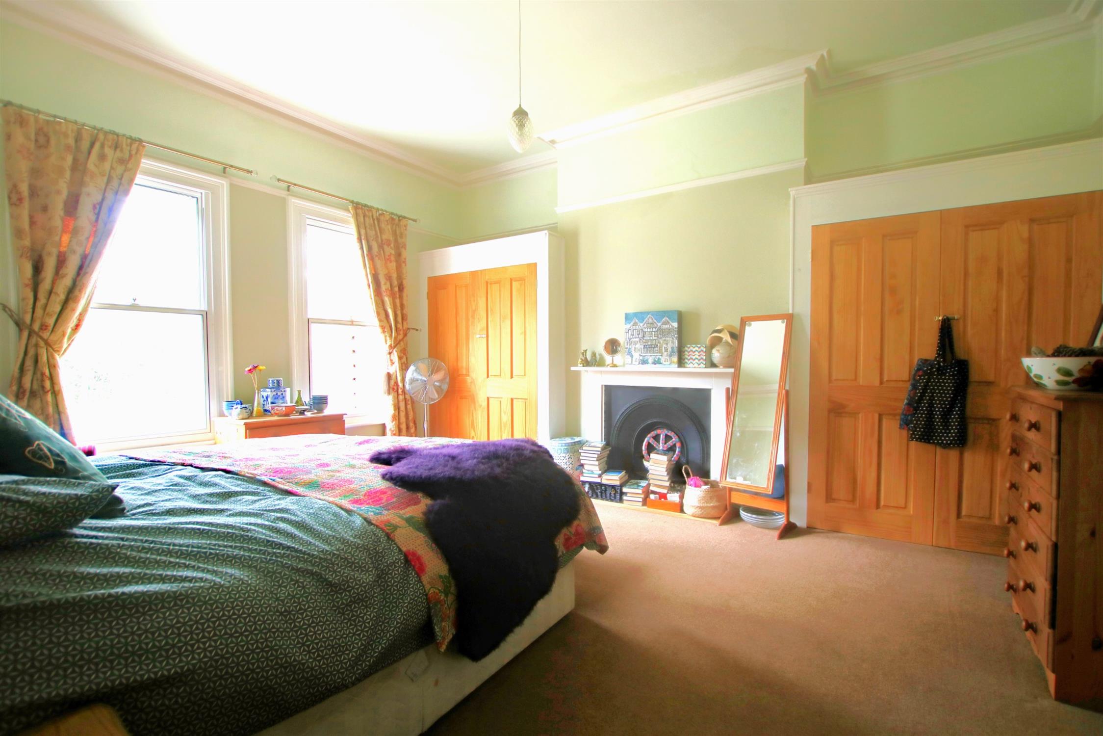 Two sash windows to front elevation with secondary glazing. Feature fireplace with wooden surround. Radiator. Built-in double width storage cupboards. Ornate coved ceiling. Smooth plaster finish. Picture rail.