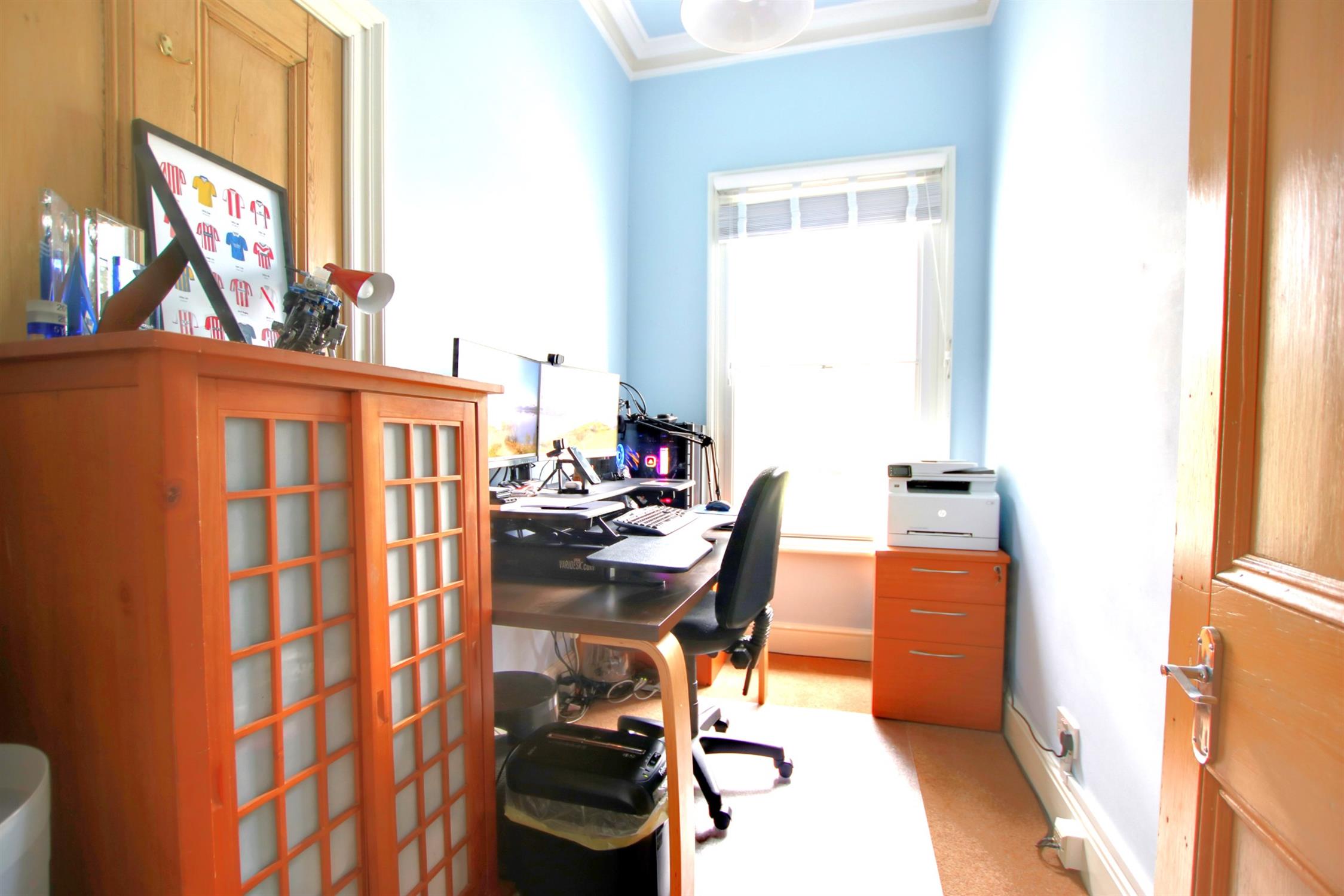Two sash windows with secondary glazing. Smooth plastered and ornate coved ceiling. Picture rail. Radiator. Feature fireplace with wooden mantle over tiled insert and partially tiled hearth. Built-in double width storage cupboards. Further door to bedroom/study