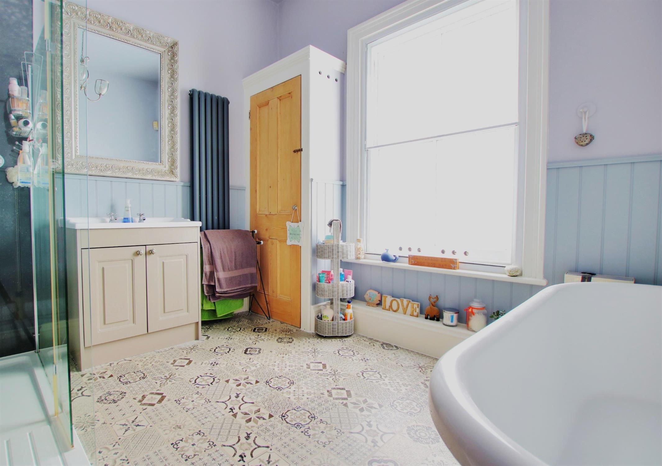 This luxuriously appointed room features an oversized walk in shower with rainfall style shower head and body washing attachment, roll top claw foot freestanding bath. Vanity unit with rectangular sink. Feature radiator.Sash window with secondary double glazing. Built in stoarge cupboard. Part wood panelling with colourwash finish and tlle effect flooring.