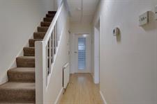 Obscure glass window to front aspect. Textured ceiling. Radiator. Stairs to first floor. Laminate flooring. Coats cupboard. Door to:-