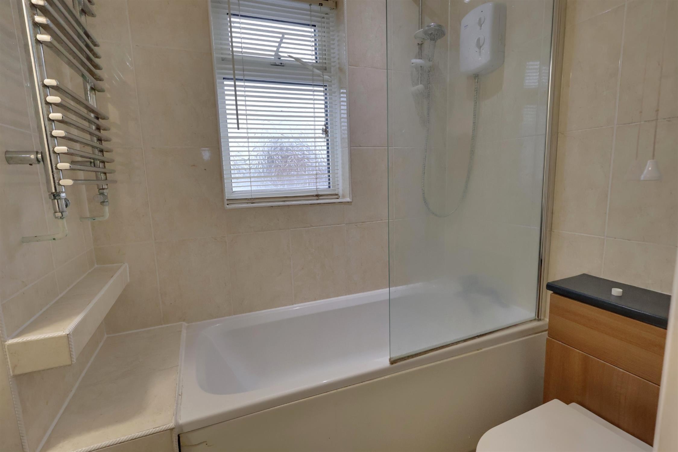 Double glazed obscure glazed window to front aspect. Vanity wash basin with mixer tap and cupboard under, panel enclosed bath with mixer tap and shower over and low level flush w.c. Tiled walls. Heated towel rail.