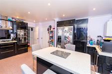 Double glazed window to rear aspect. Double glazed French doors opening onto rear garden. Coving to smooth ceiling with recessed lighting. Single drainer one and a half bowl sink unit with swan neck mixer tap and cupboard under. A range of matching eye level and base mounted units. Integrated dishwasher and washing machine. Built-in double oven with fitted four ring gas hob and extractor over. Space and plumbing for American style fridge/freezer. Wall mounted boiler. Island unit. Radiator. Tiled flooring.