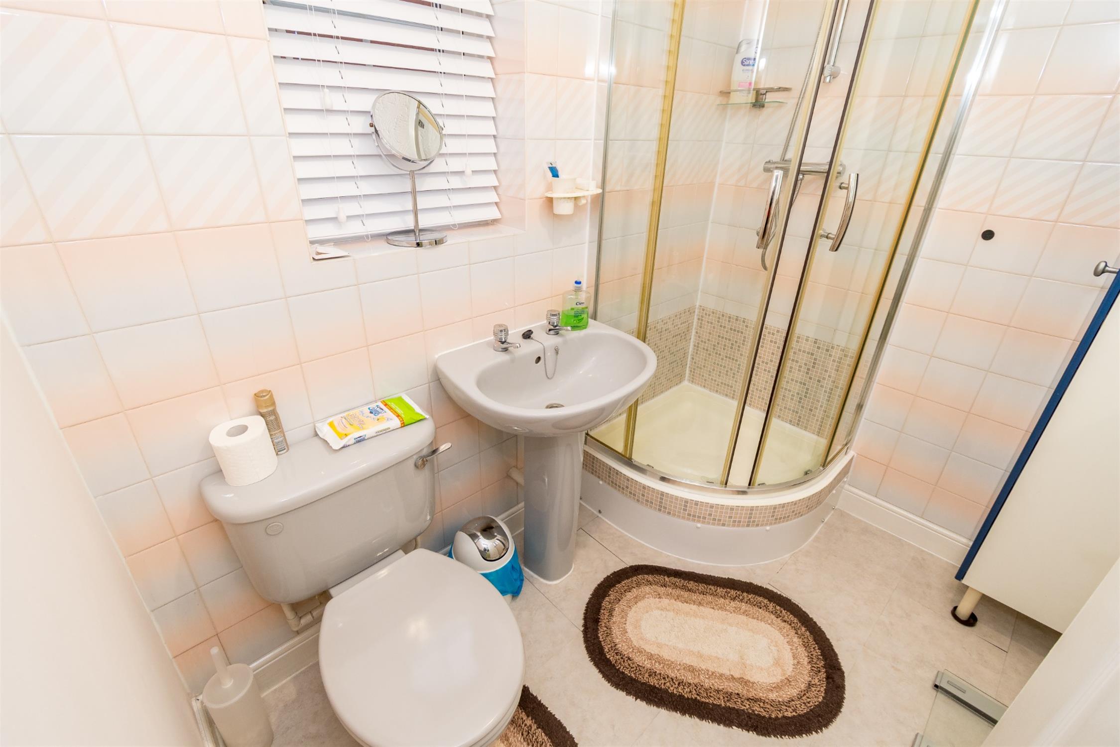 Double glazed obscure glass window to side aspect. Coving to textured ceiling. Wash basin, low level flush w.c. and tiled shower cubicle. Heated towel rail.