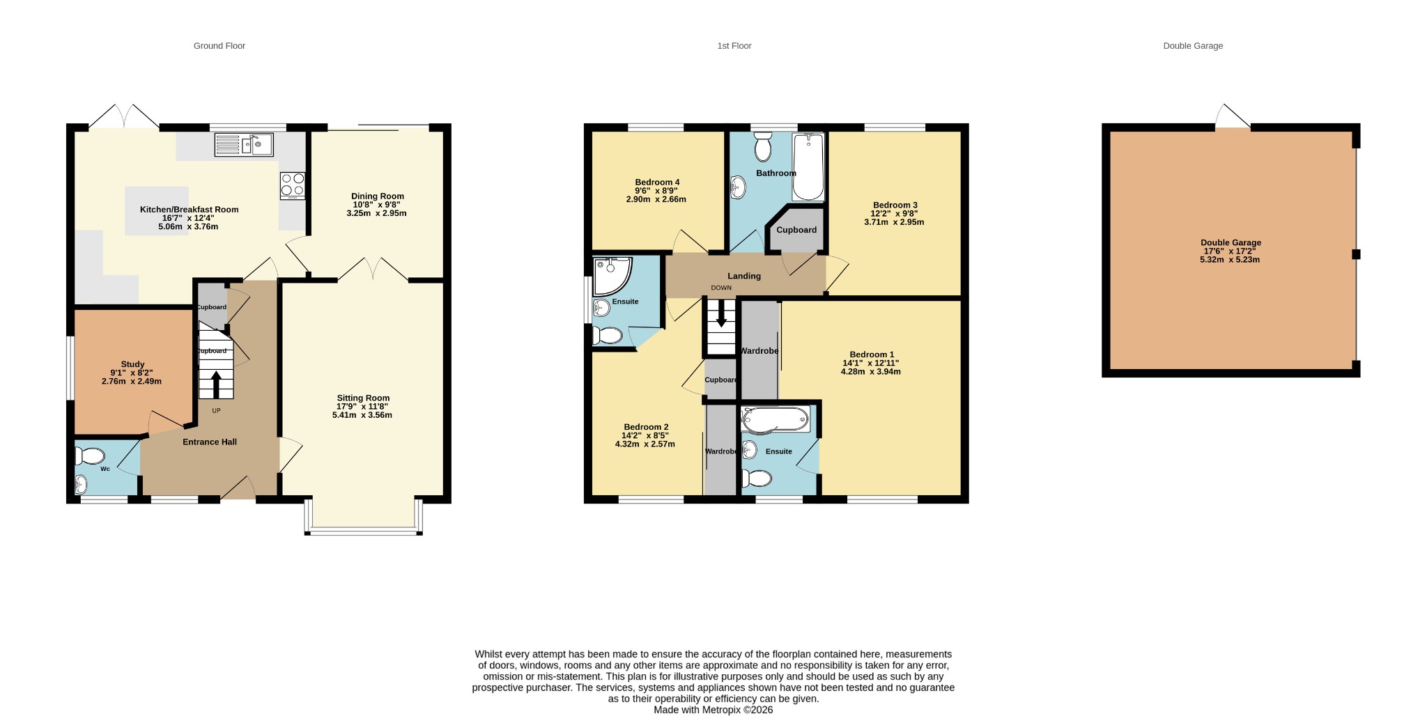 The front garden is principally laid to lawn with path to main entrance door and gated pedestrian access to the rear. There is a driveway offering off road parking for up to four vehicles and providing access to the DETACHED DOUBLE GARAGE 17' 6" x 17' 1". Two individual up and over doors, personal door to side and power and light. Additional storage in the rafters.