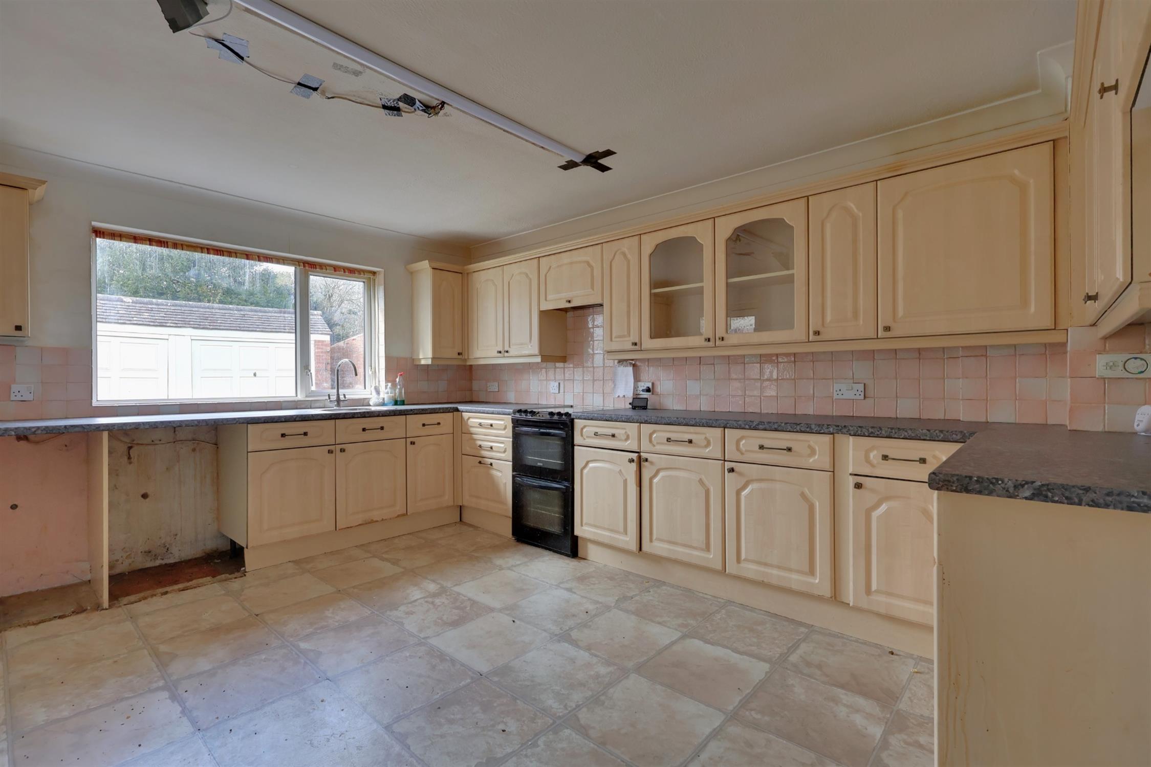 A range of wall and base cupboards with work surface over. Stainless steel sink with drainer. Four ring gas hob with extractor fan over and double oven. Plumbing for washing machine. Radiator. Door to conservatory. Double glazed window.