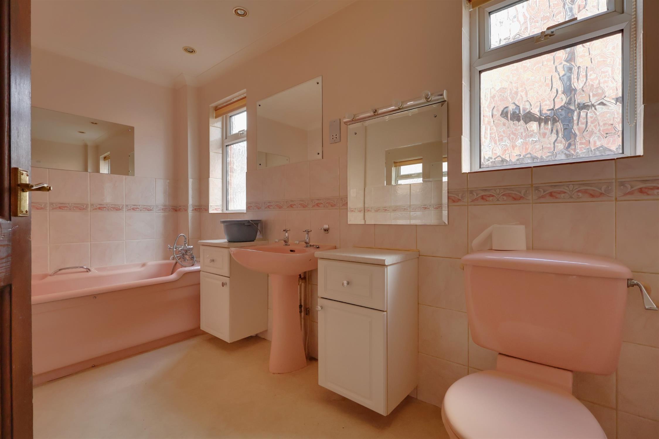 Panelled bath with mixer tap. WC. Ceramic sink. Radiator. Two frosted double glazed windows.