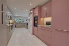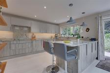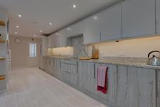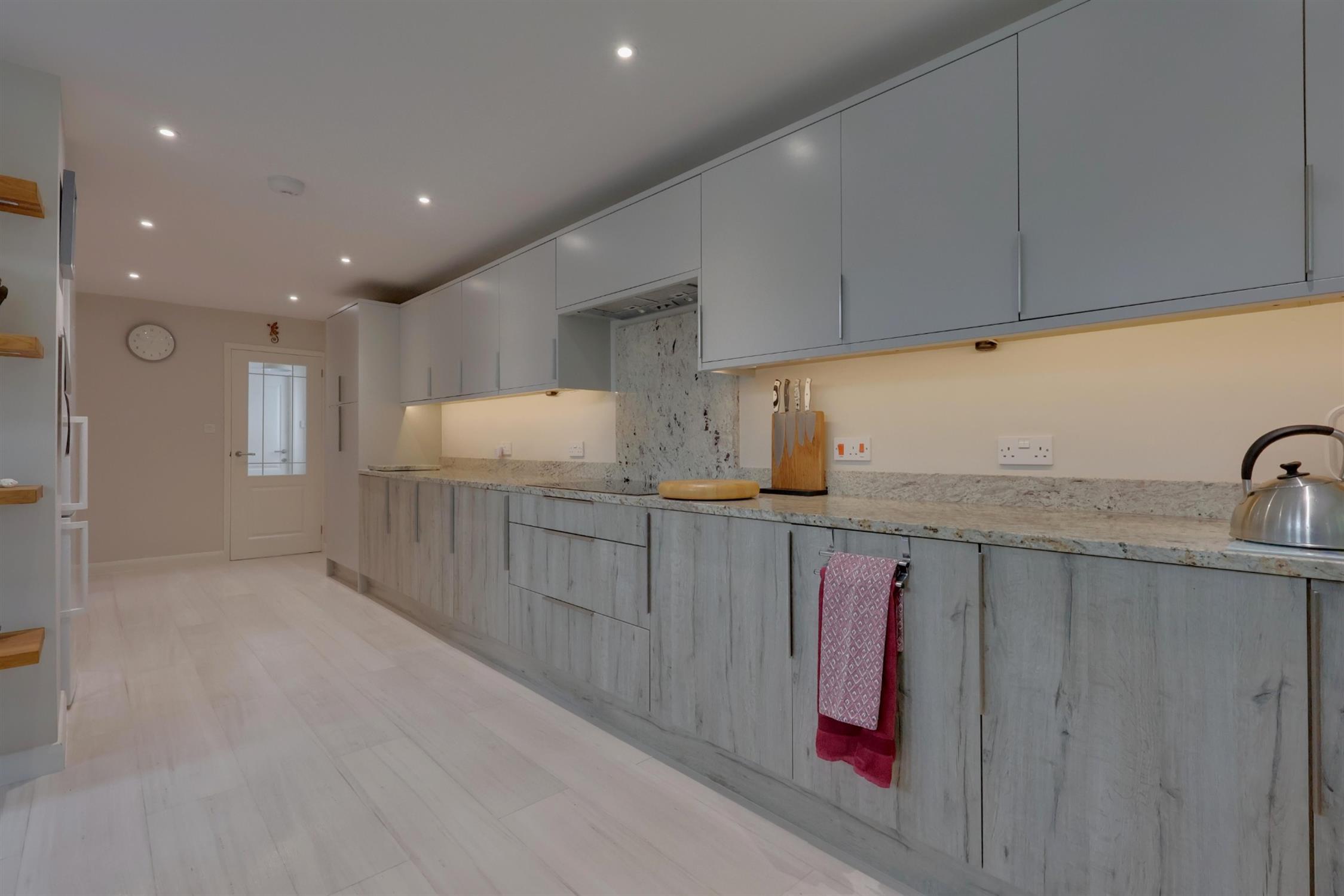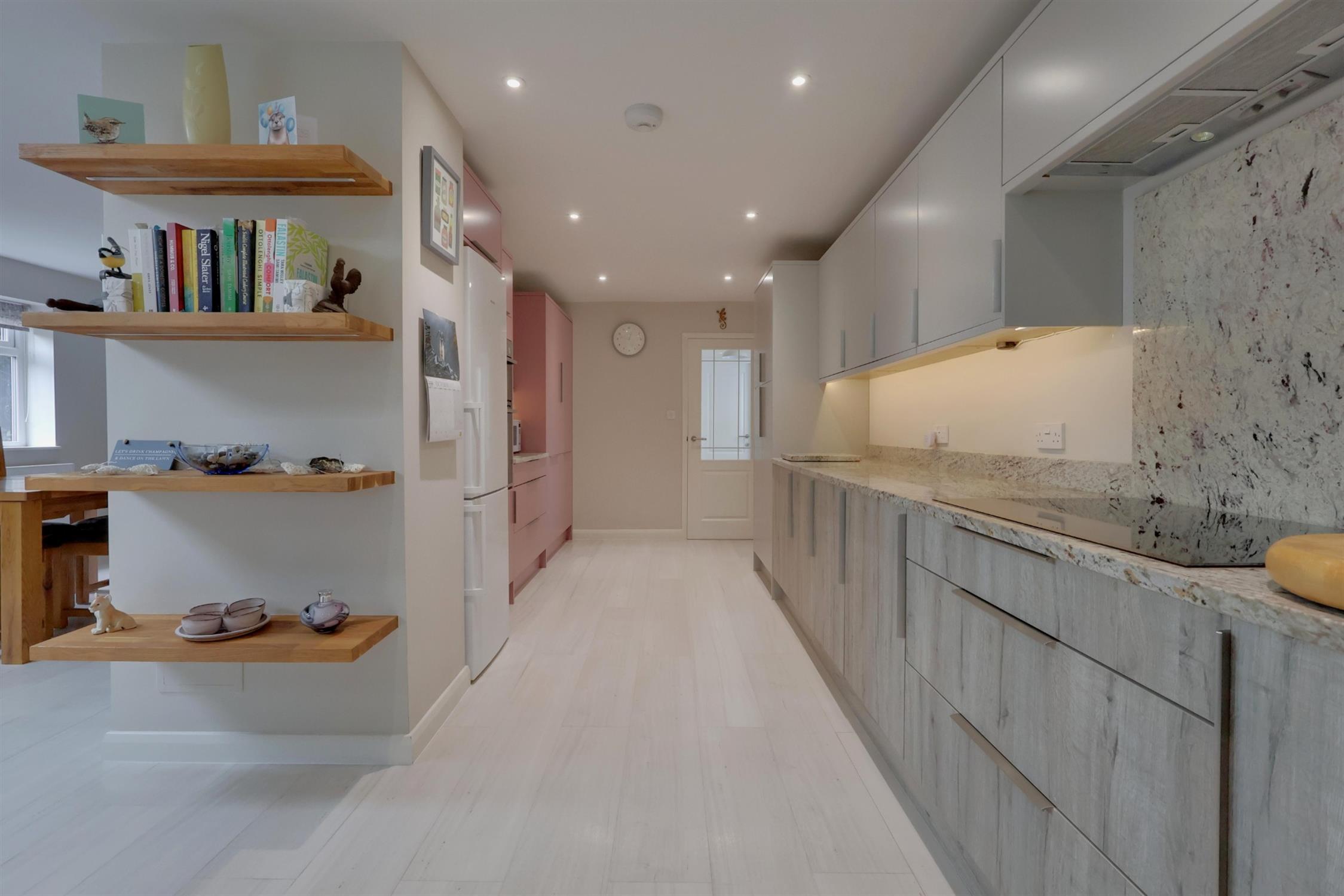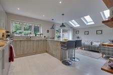 A range of wall and base cupboards with Granite work surface over. Five ring induction hob with extractor fan over. Integrated double oven, dishwasher and washing machine. Fridge/freezer. Inset one and a half sink unit with drainer. Breakfast bar. Pantry cupboard. Double glazed window. Sliding doors to the garden. Three skylights.