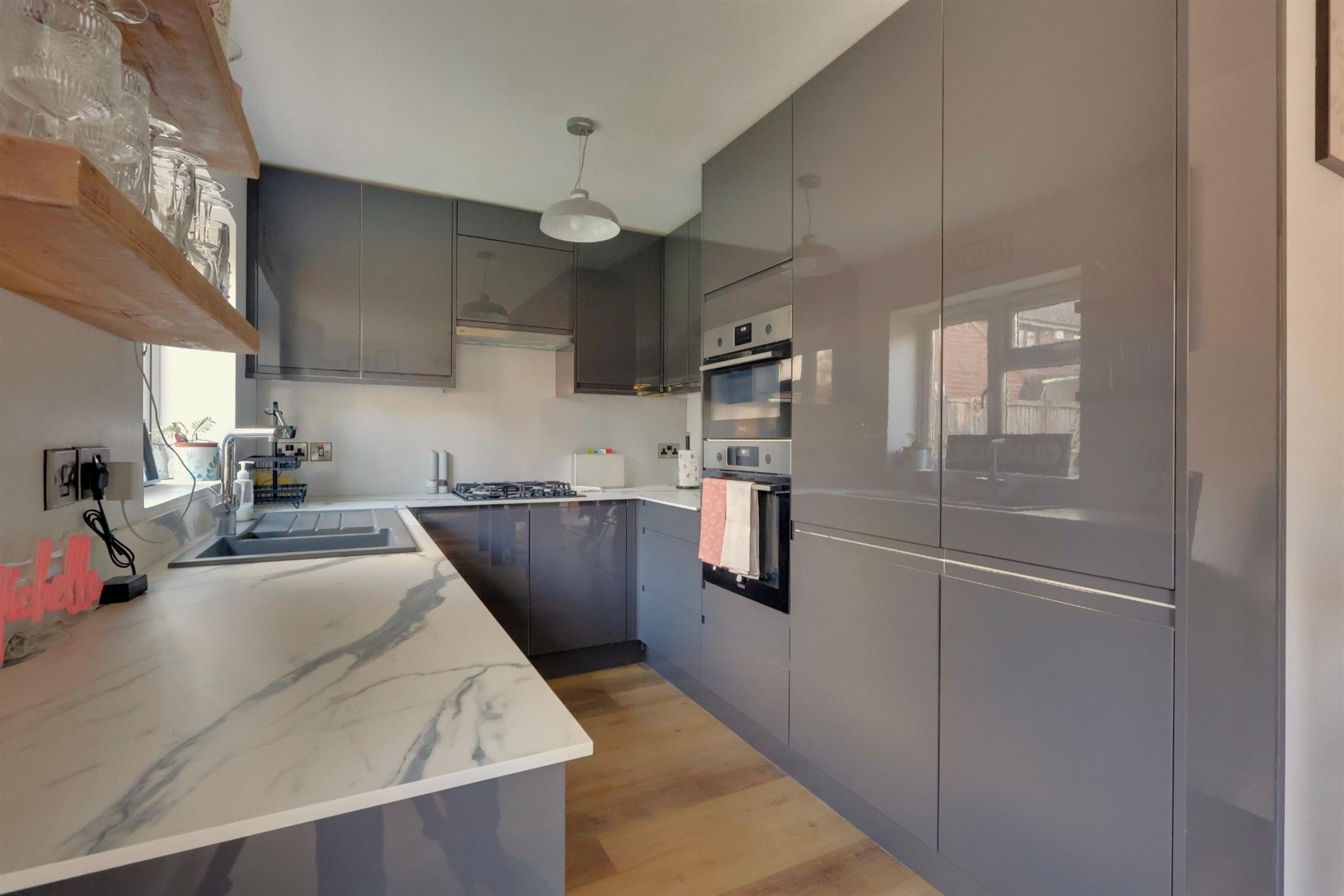 A range of wall and base cupboards with work surface over. Integrated fridge/freezer, double oven with microwave and dishwasher. Inset one and a half sink unit with drainer. Four ring gas hob with extractor fan over. Radiator. Double glazed window. Door to rear garden.