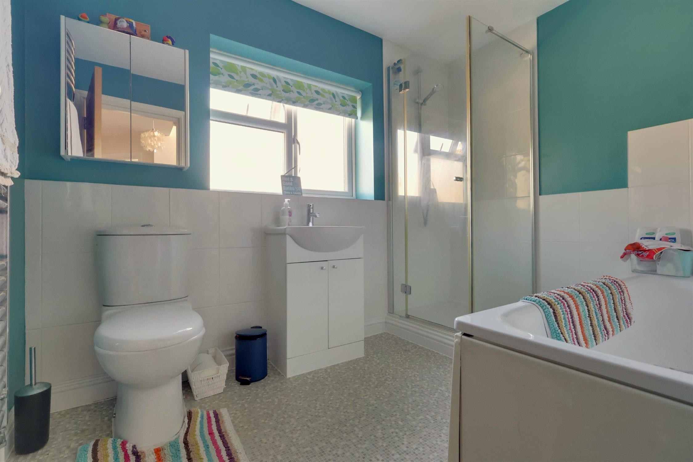 Shower cubicle. Panelled bath with shower attachment. WC. Ceramic sink with cupboard under. Heated towel rail. Extractor fan. Frosted double glazed window.