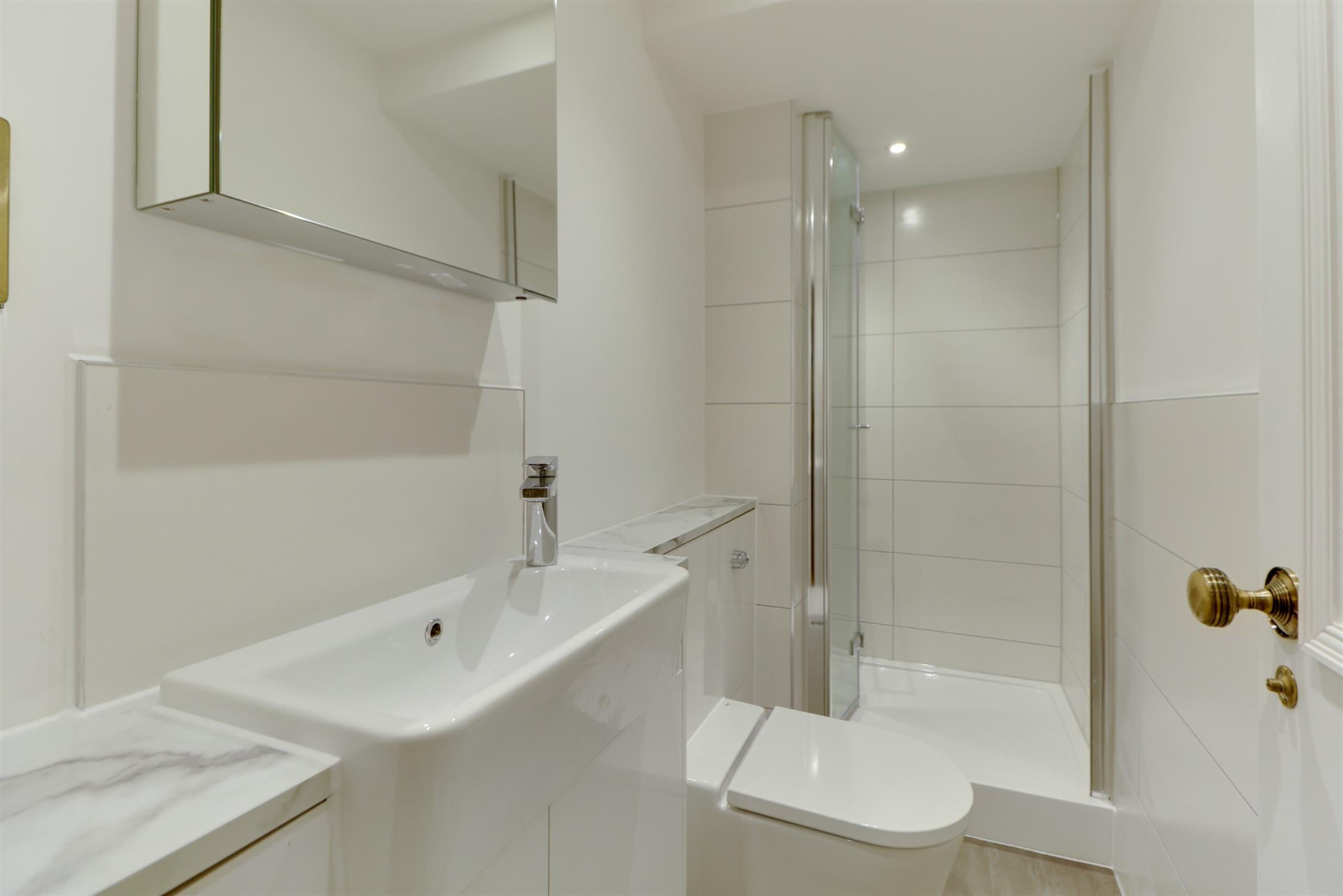 Smooth ceiling, inset spotlights, extractor fan, double glazed obscured sash window, low level WC, corner shower cubicle, wash hand basin with cupboards beneath, mirrored bathroom cabinet, shaver point, heated towel rail, tiled walls, Karndean flooring, underfloor heating.