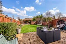 Accessible from the conservatory, the garden features a patio area, neat lawn, garden shed, and a pergola with seating area.