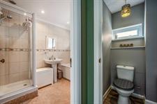 A bathroom with shower, bath, toilet, and basin.