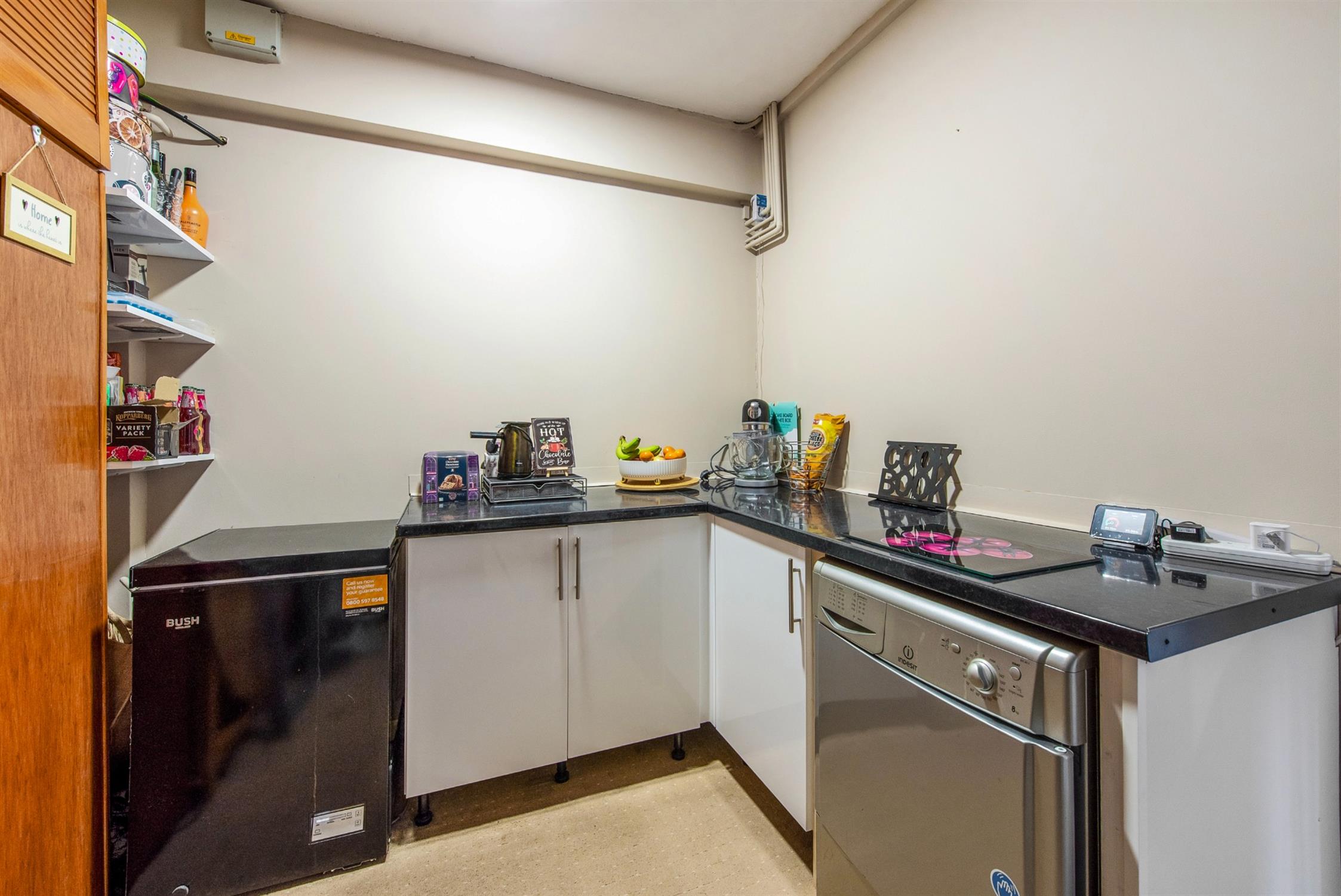 Fitted with an electric oven and hob, with space for a washing machine and dishwasher.