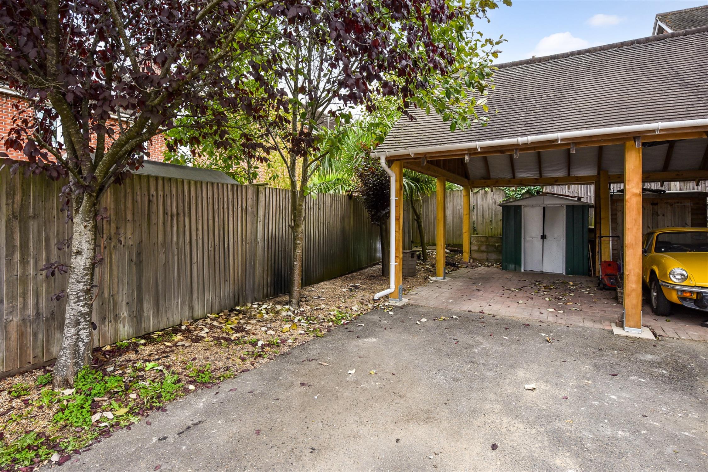 To the side of the house is a shared car port for one car and a space aligned in front.
