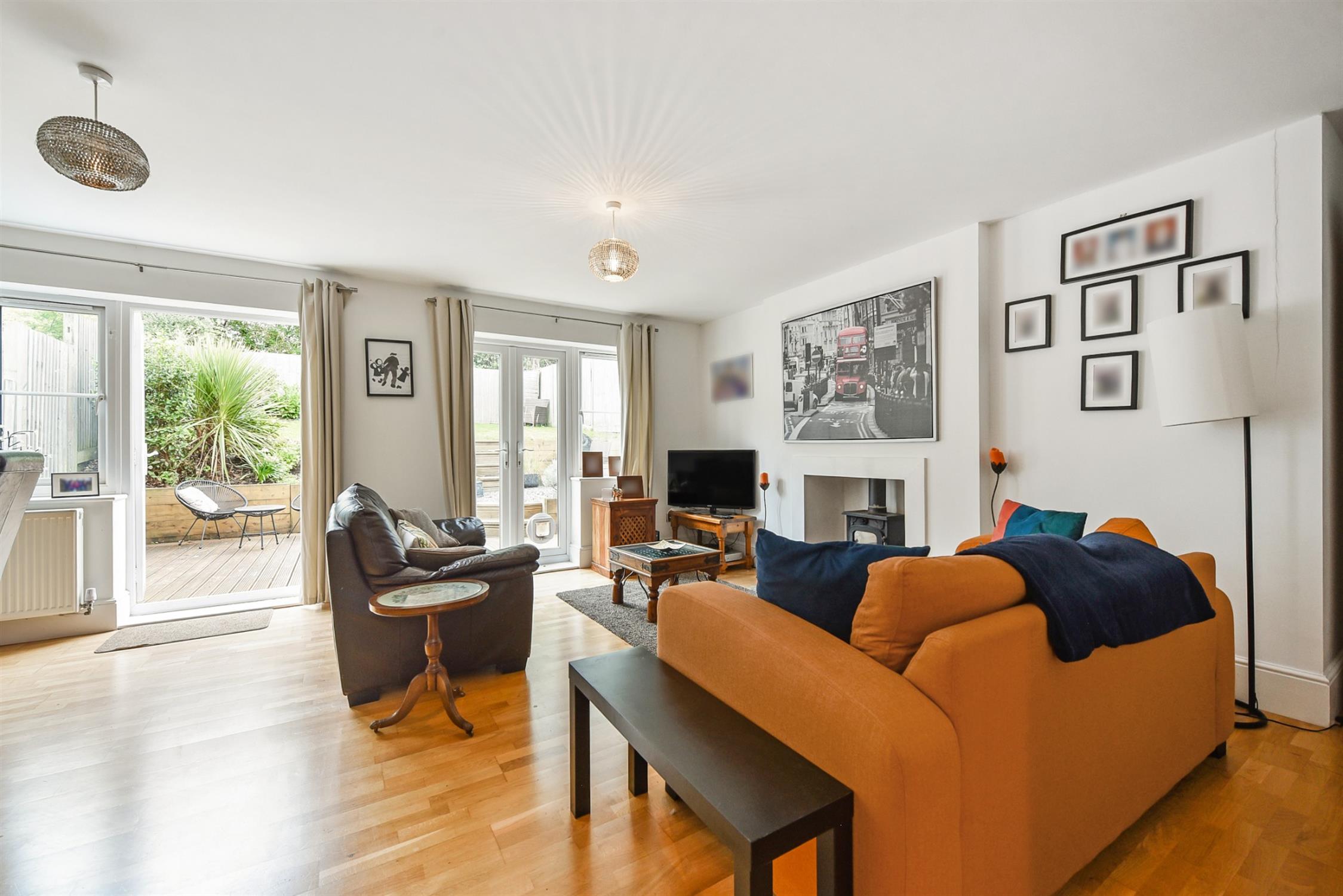 A light and bright space can be used for both living and dining, with double doors providing access to the rear garden patio. A woodburner set on a stone hearth adds a cosy touch to the room.