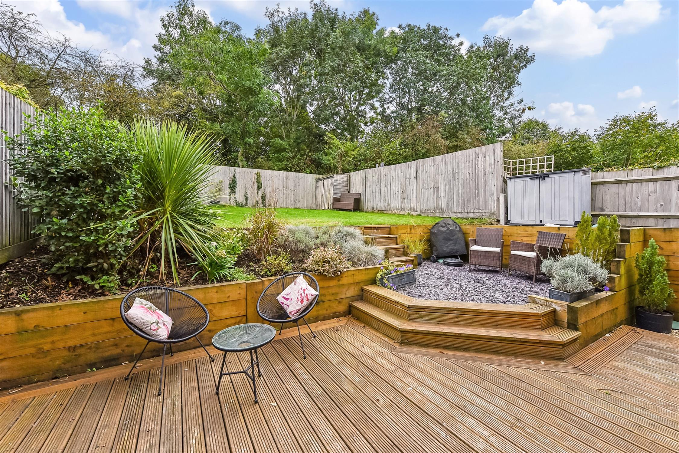 The enclosed rear garden has been landscaped with railway sleepers providing a large decking area, steps rising to a smaller sitting area, and the garden being laid lawn.