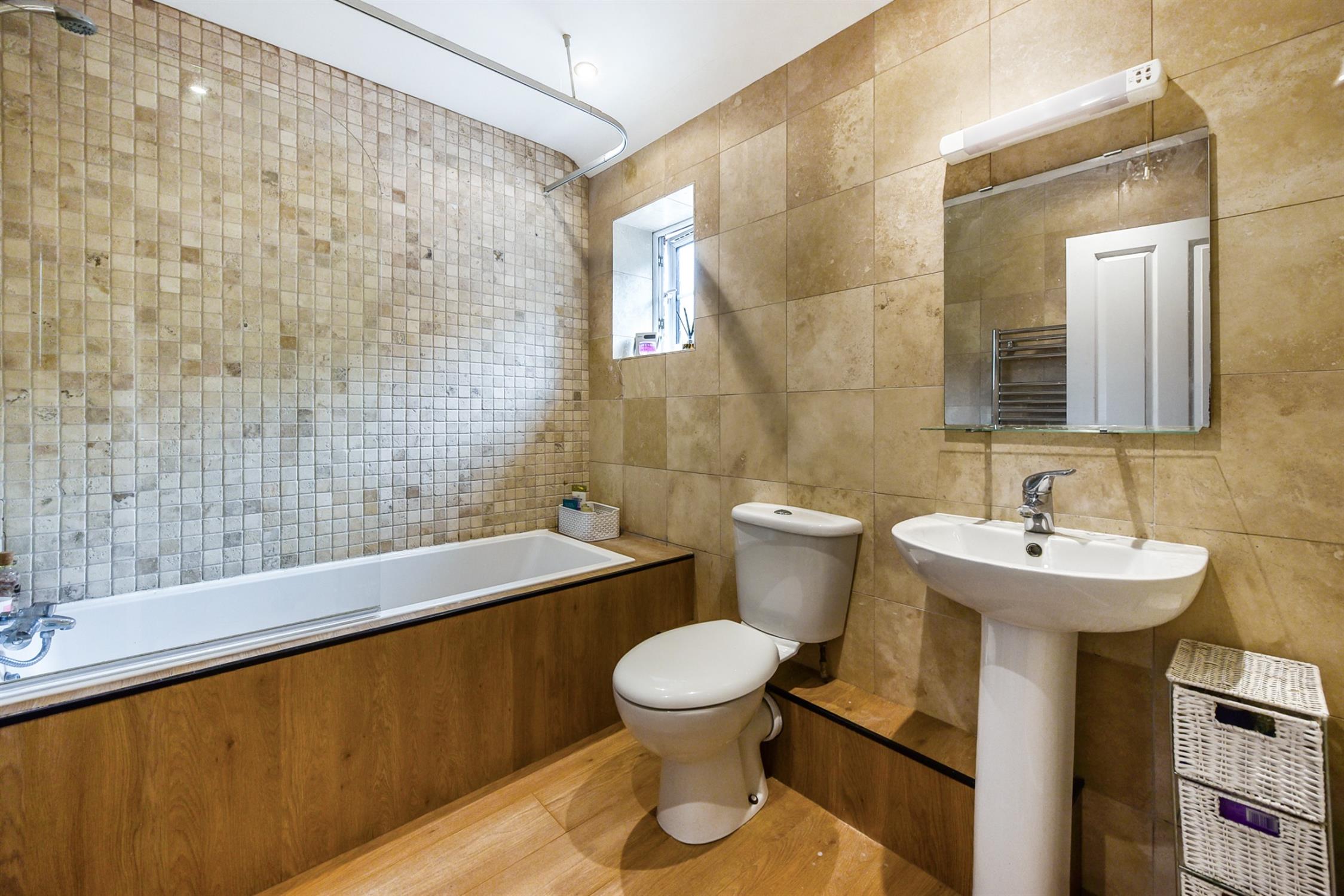 Bath and overhead shower, toilet and basin