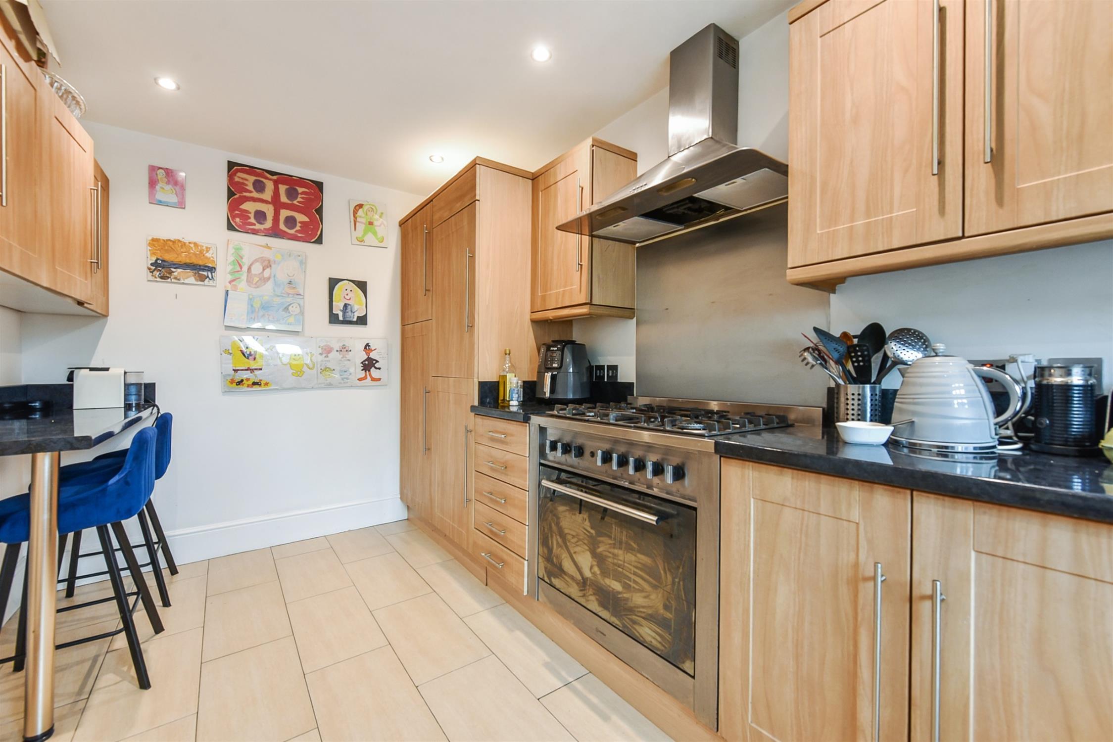 The well-presented kitchen is equipped with integrated appliances such as a washing machine, dishwasher, fridge-freezer, and a gas hob with oven – alongside generous cupboard space, a stylish breakfast bar, and modern work surfaces.