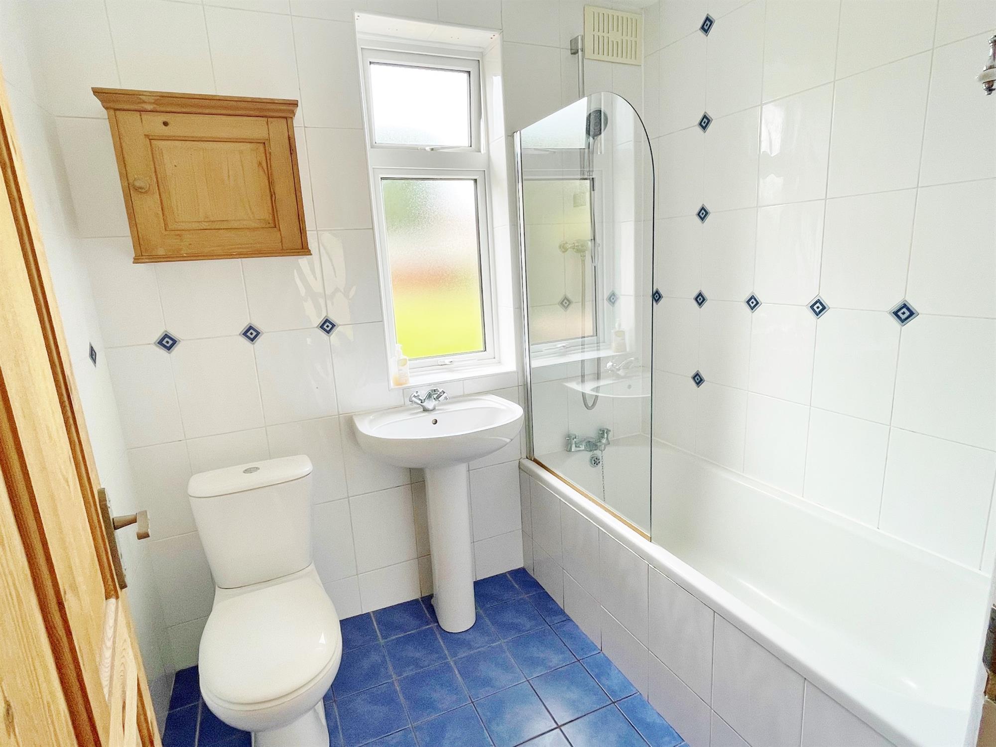 Window to rear. Low level WC. Pedestal wash hand basin. Panelled bath with shower over and glazed screen. Complementary tiling. Radiator.