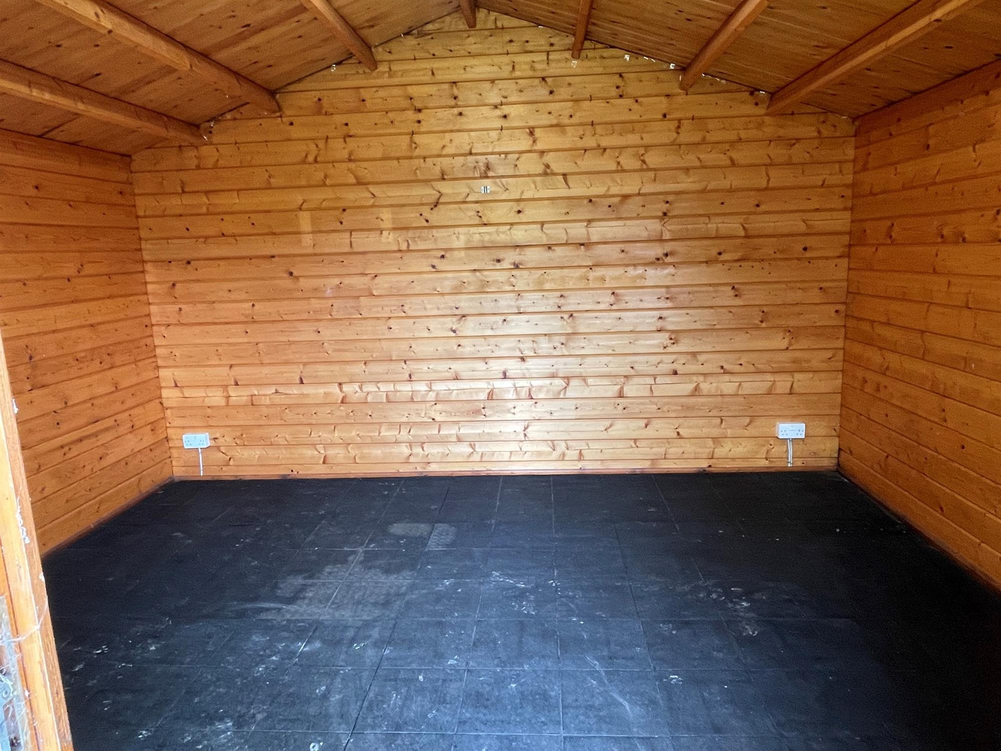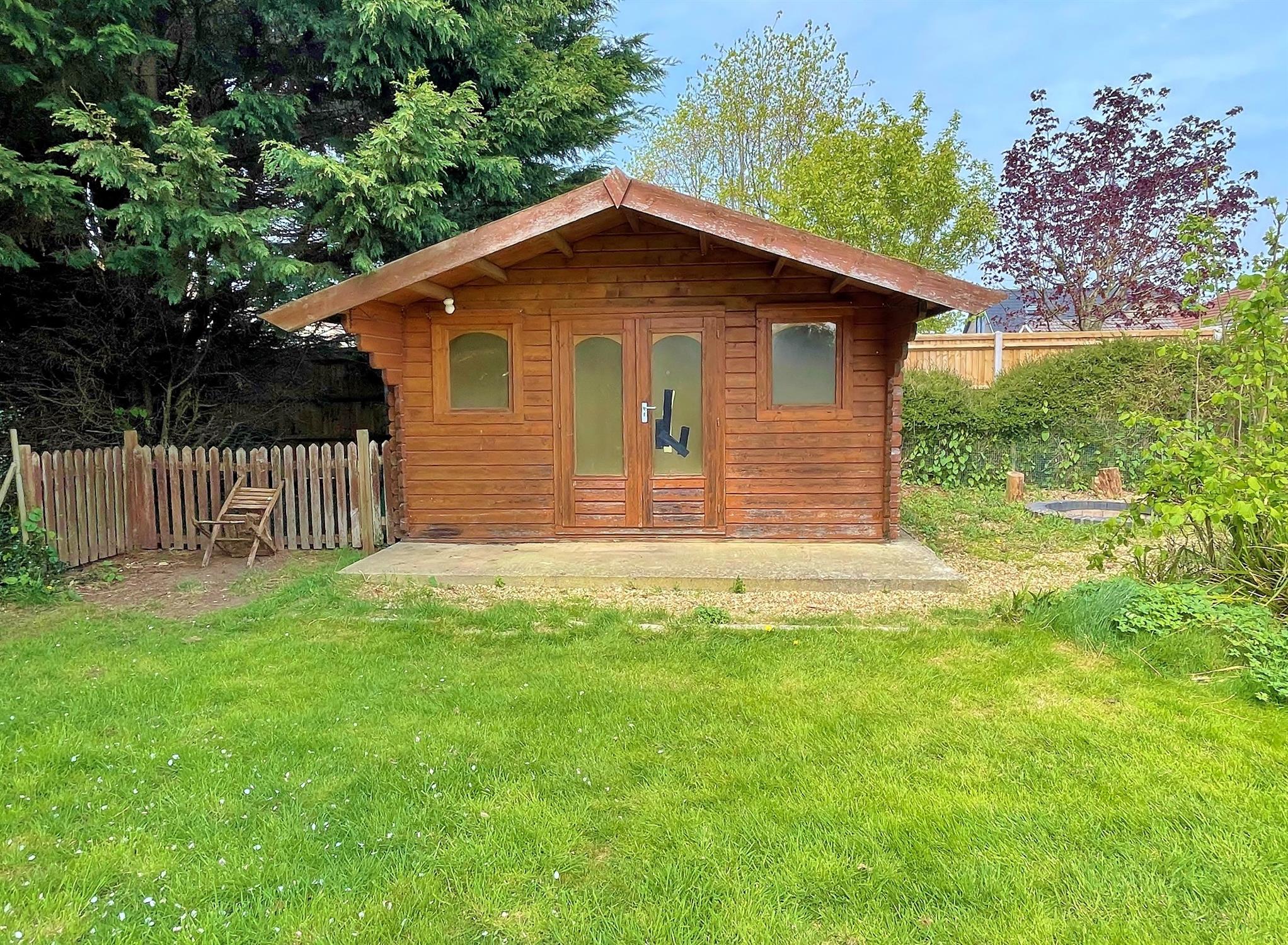Laid to lawn with shrubs, trees and bushes. Decked seating area. Timber-built cabin with power and light.