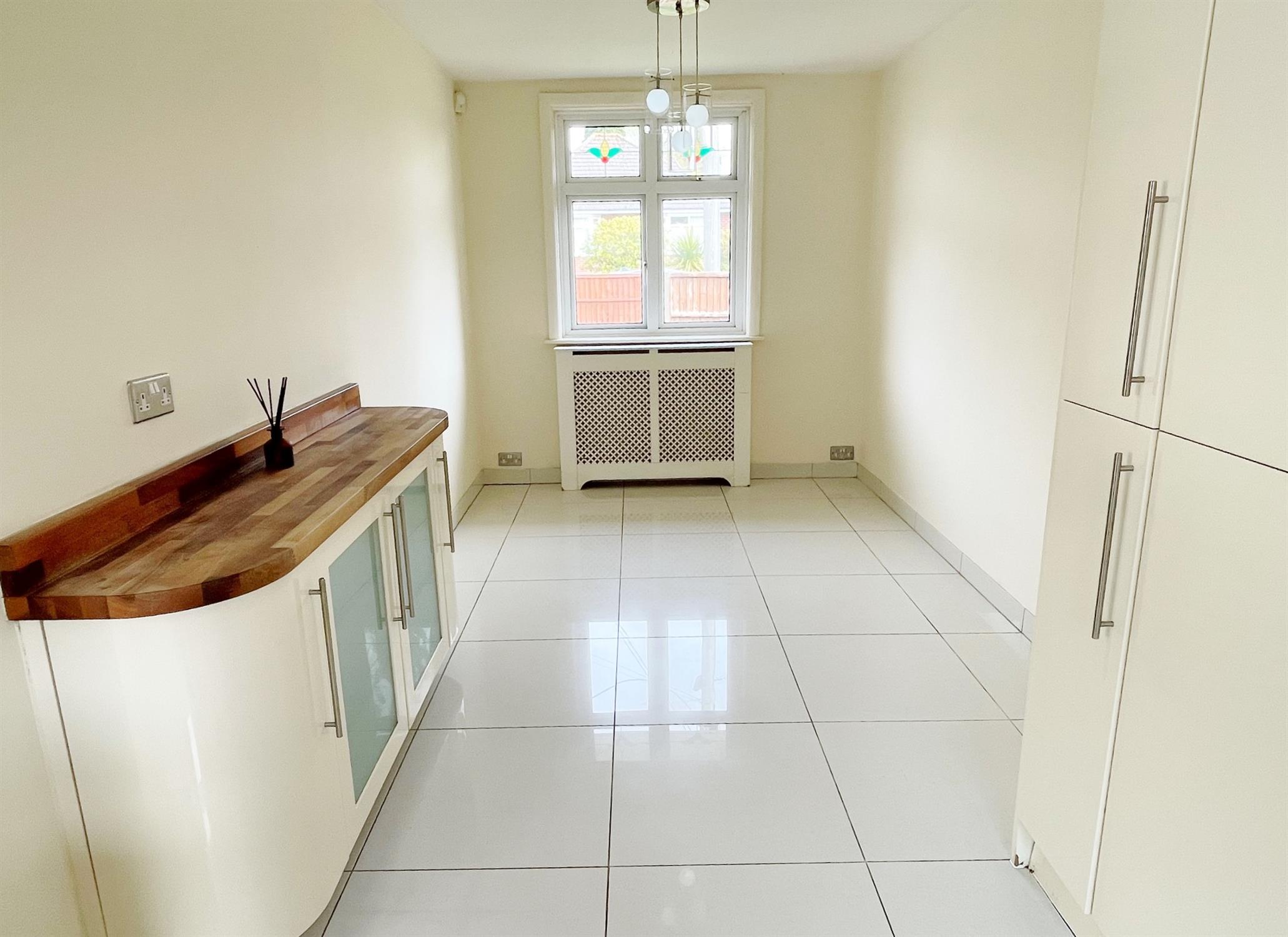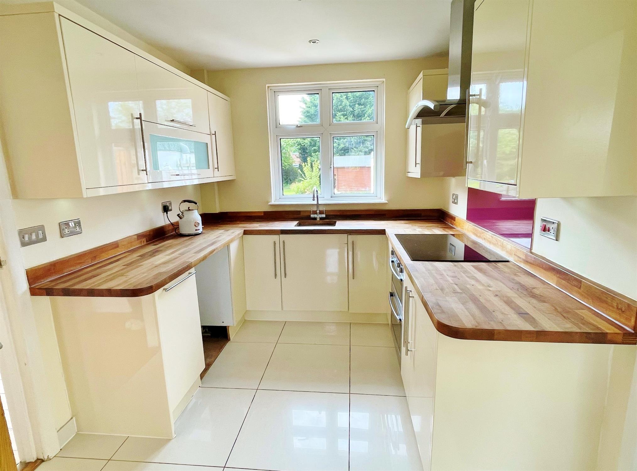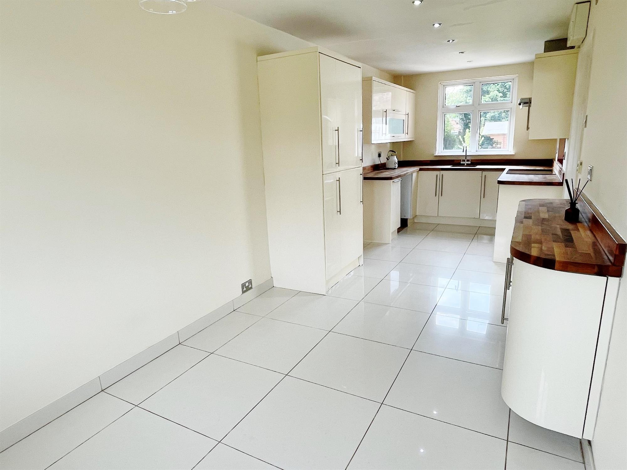 Windows to front and rear. Range of wall and base units with working surfaces over. Inset sink. 4 ring induction hob with extractor over. Built in electric double oven. Integrated dishwasher and fridge freezer. Space and plumbing for washing machine. Cupboard housing gas boiler. Concealed lighting. Underfloor heating. Tiled flooring. Radiator. Door to side.