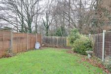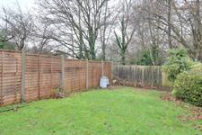 Timber fence panel enclosed, mainly laid to lawn with flowering shrubs.