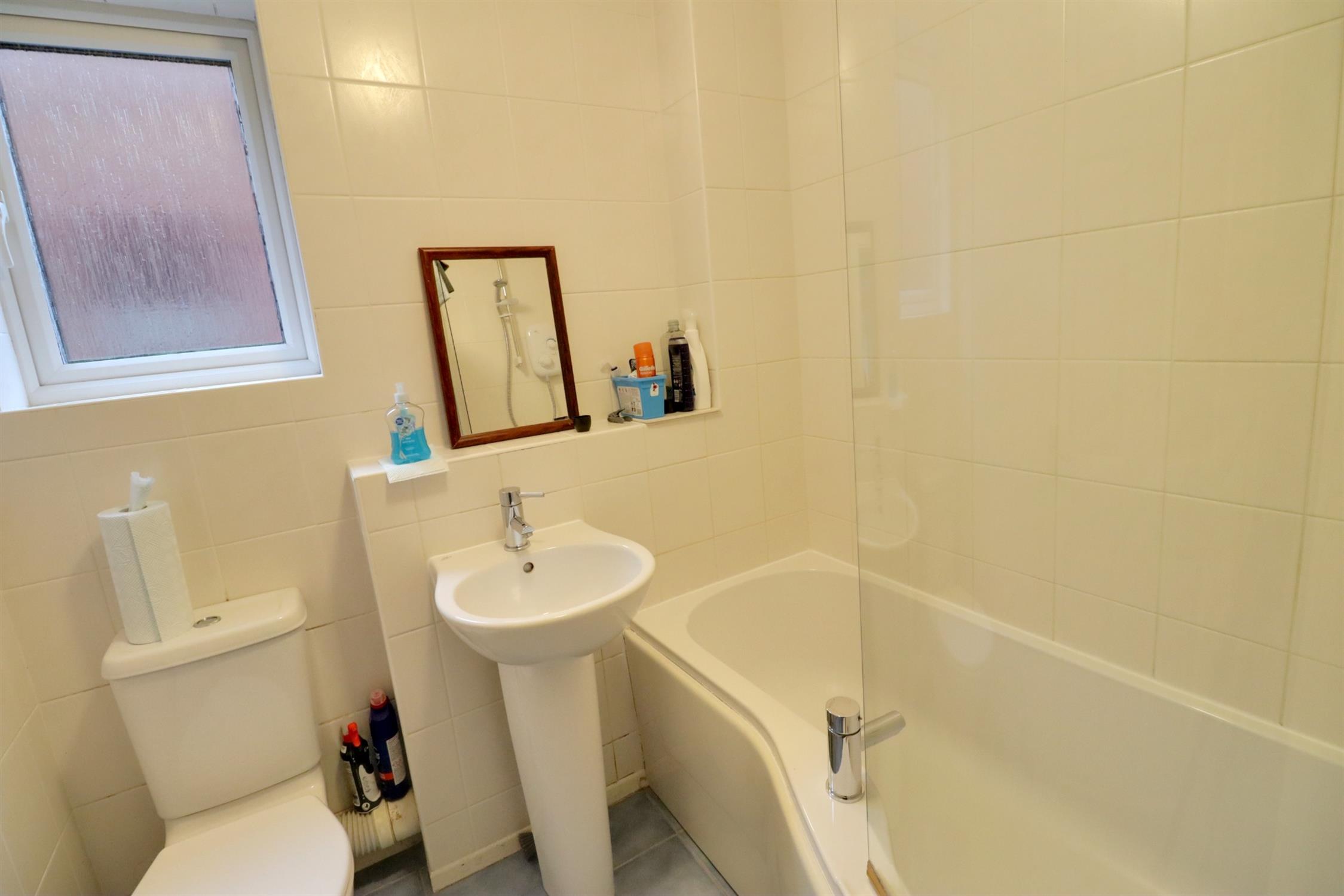 Opaque double glazed window to side, panel enclosed ‘P’ shaped bath with electric shower and curved shower screen, pedestal hand basin, WC, radiator, tiled walls and flooring.