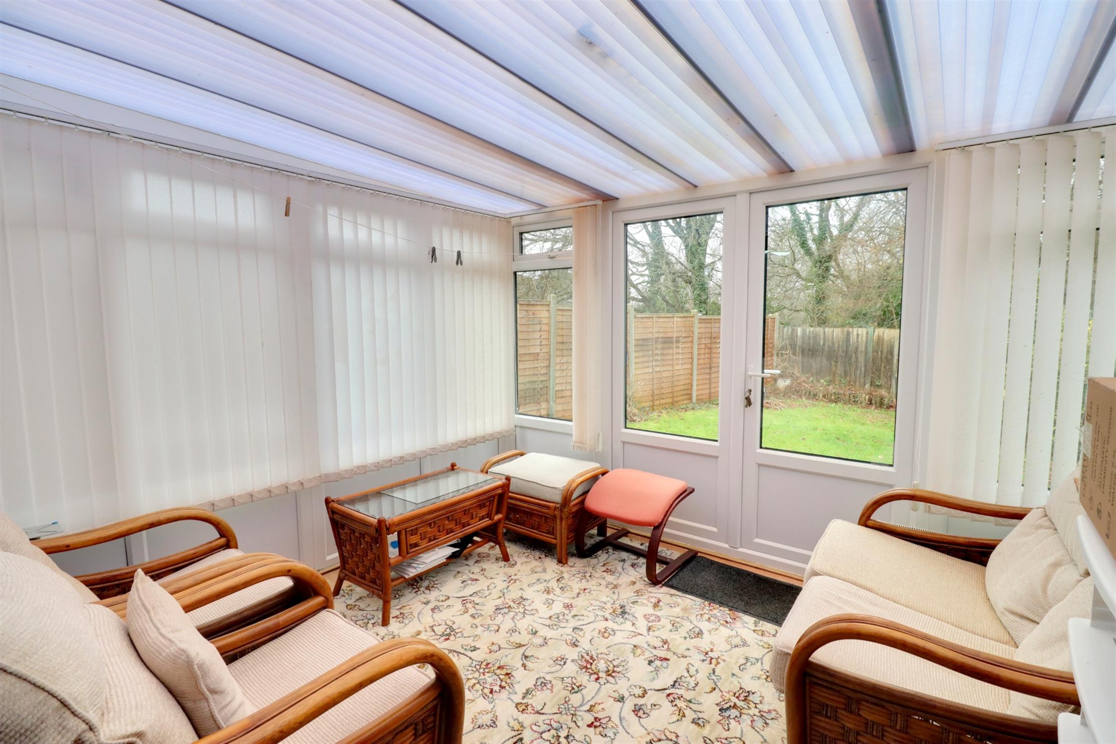 Two timber-framed windows to rear and door to conservatory, matching range of white fronted wall and base units, roll edge worksurfaces, insert stainless steel one and a half bowl single drainer sink with mixer tap, four ring gas hob, electric oven, overhead extractor, space and plumbing for washing machine, space for tall fridge/freezer, radiator, tiled splash backs, tiled flooring.