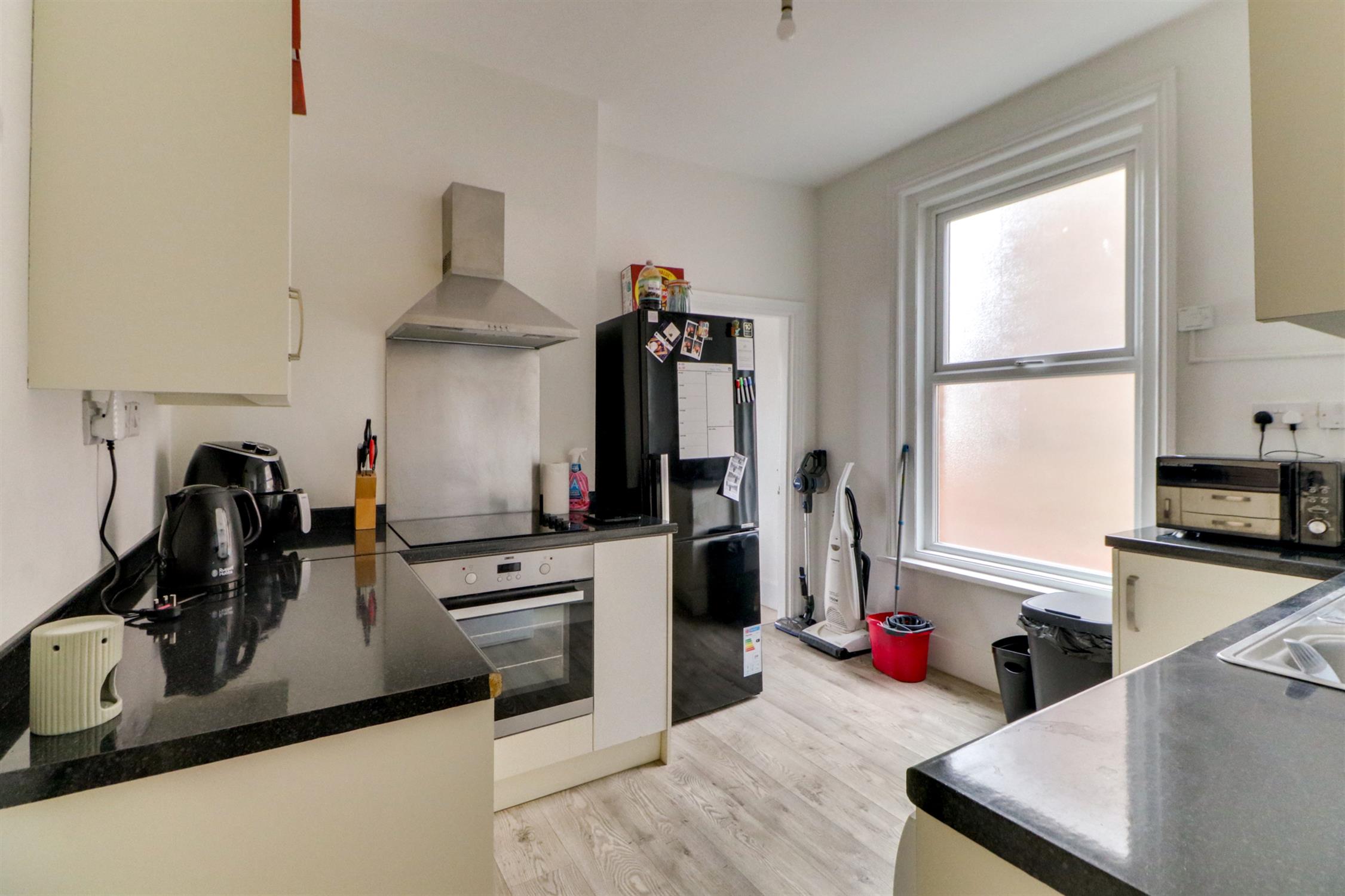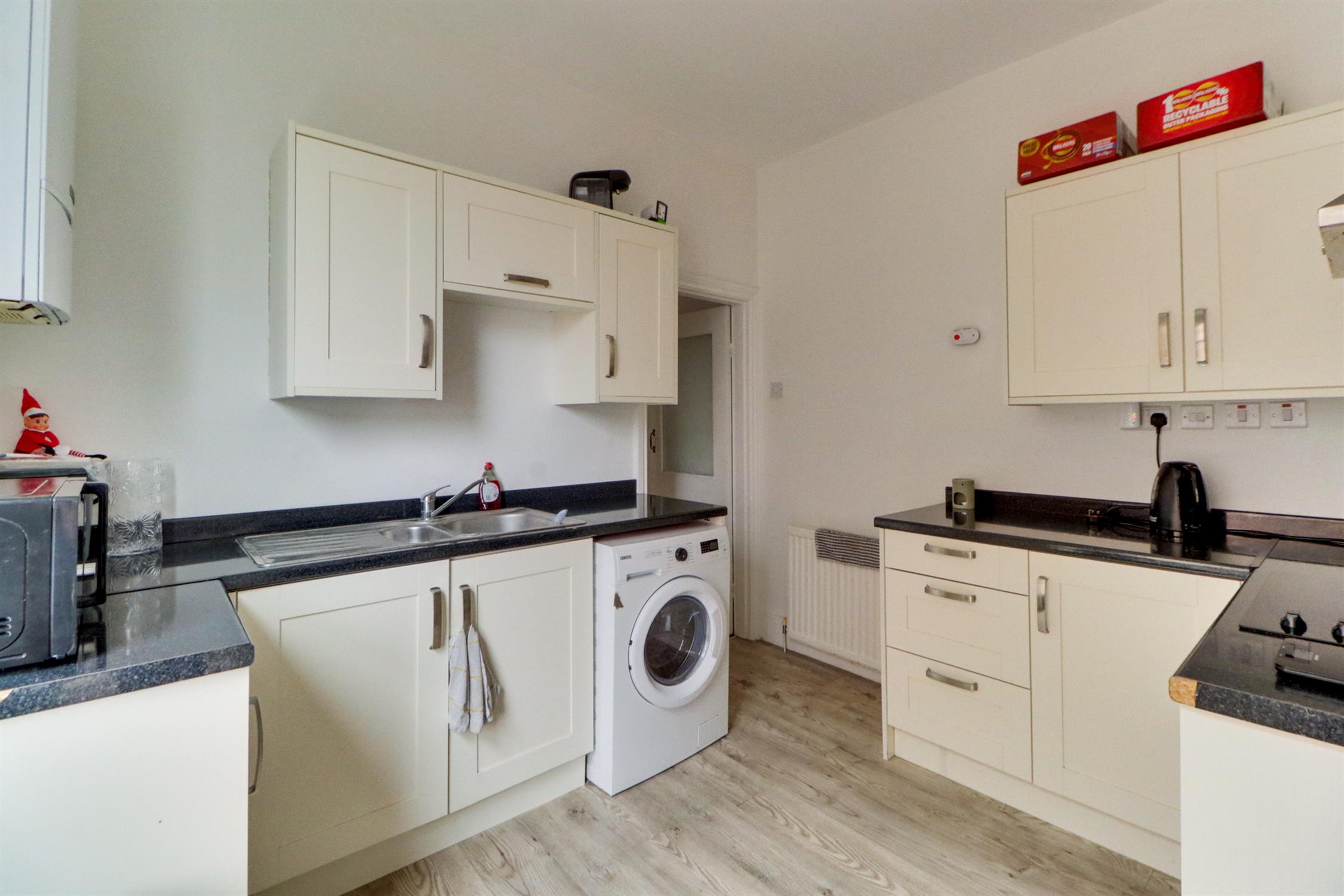 Smooth ceiling, UPVC double-glazed window, wall-mounted boiler, a range of wall and base-mounted units with roll-top work surfaces over, inset sink drainer, electric hob and oven with extractor fan over, space for appliance, radiator and laminate flooring.