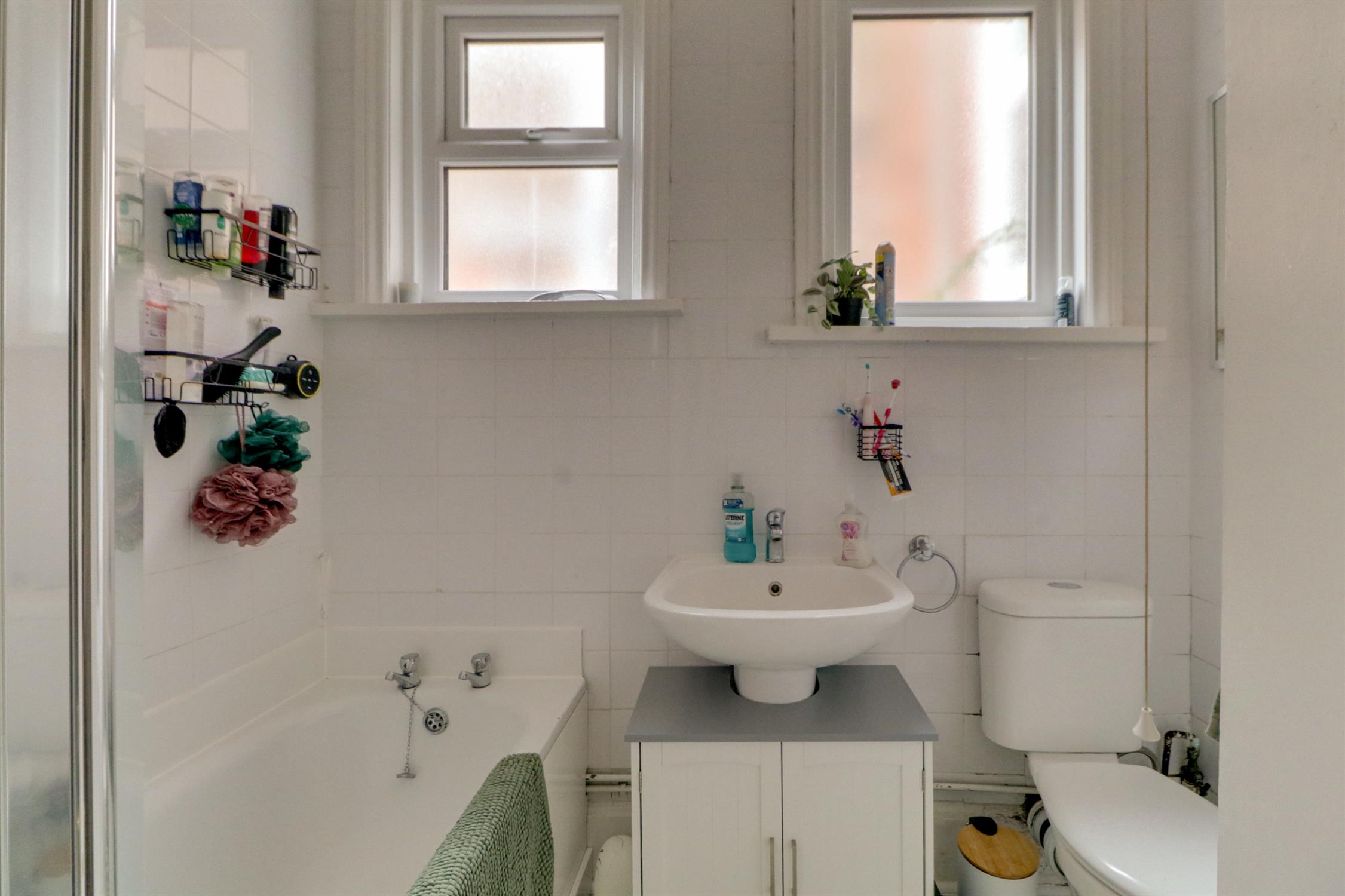 Textured ceiling, extractor fan, UPVC double-glazed window, bath with shower over, wash hand basin, low level W.C, radiator and vinyl flooring.