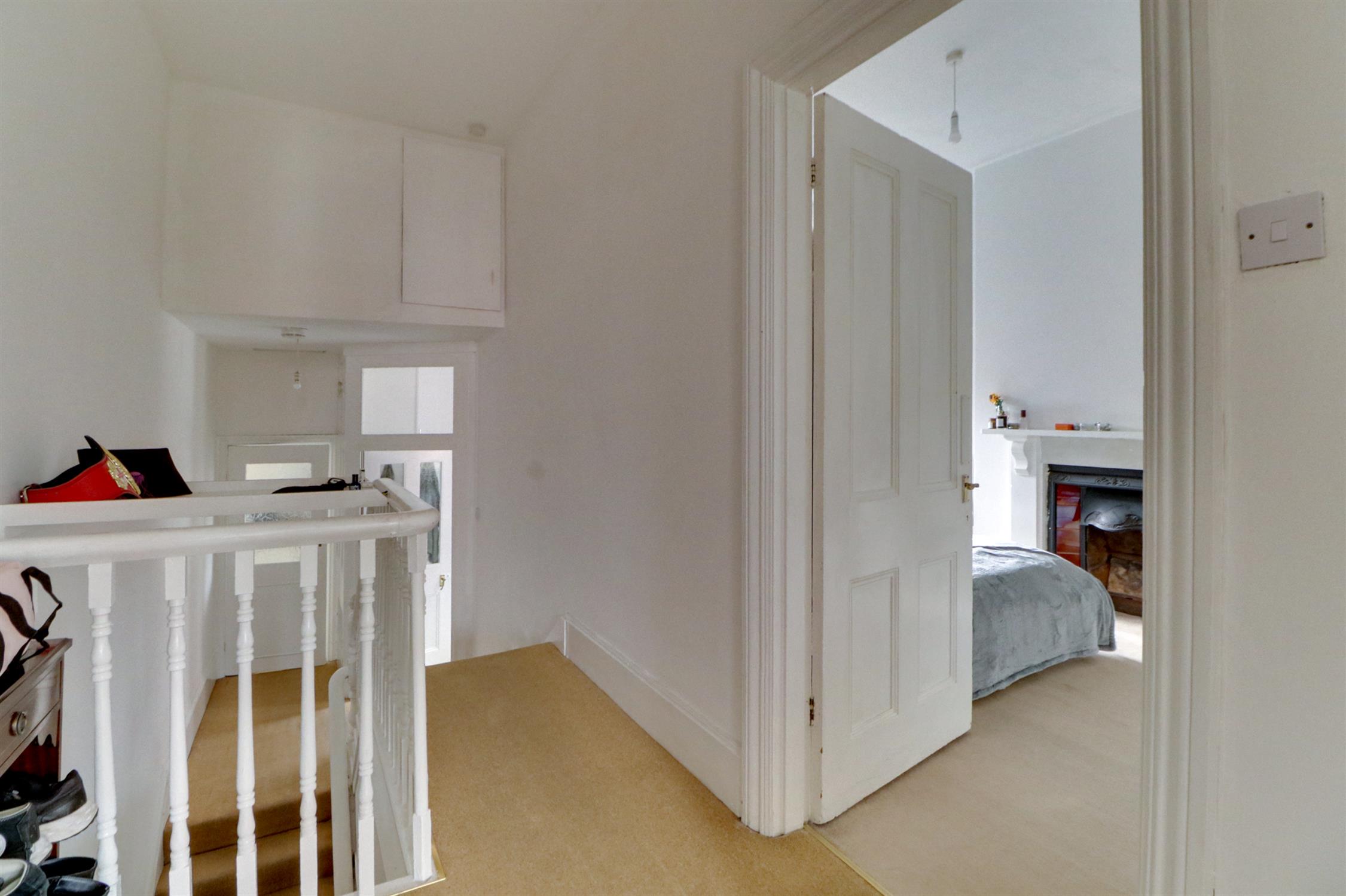 Textured and coved ceiling, split-level landing, storage cupboard, fitted carpet and doors into;