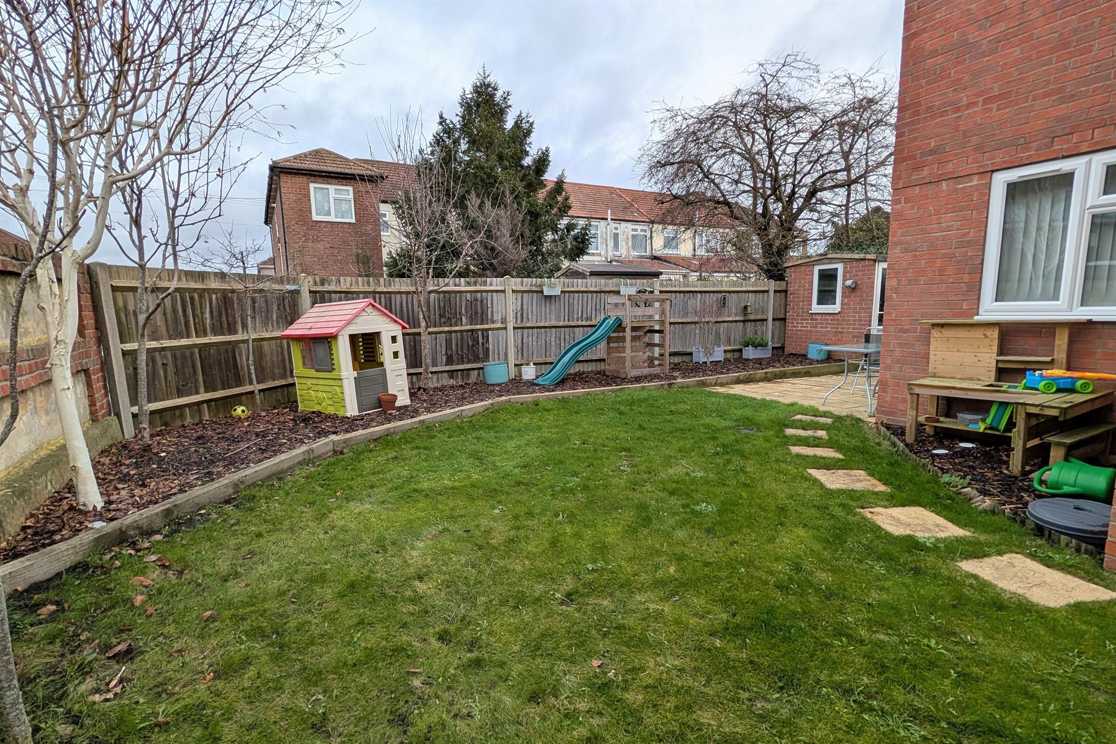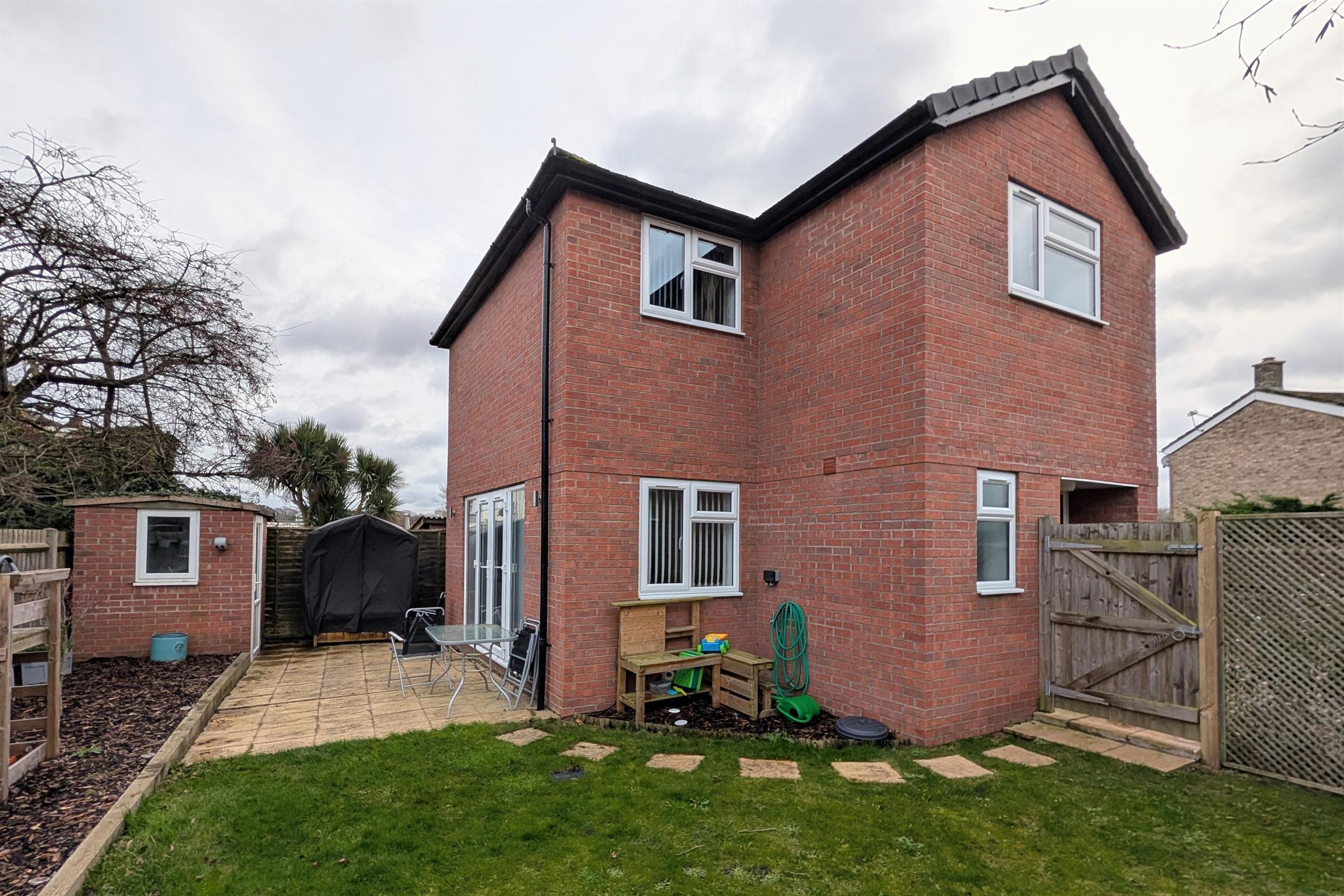 The laid to lawn garden area has a raised barked area with planted trees. Brick store with double glazed door. Outside tap.